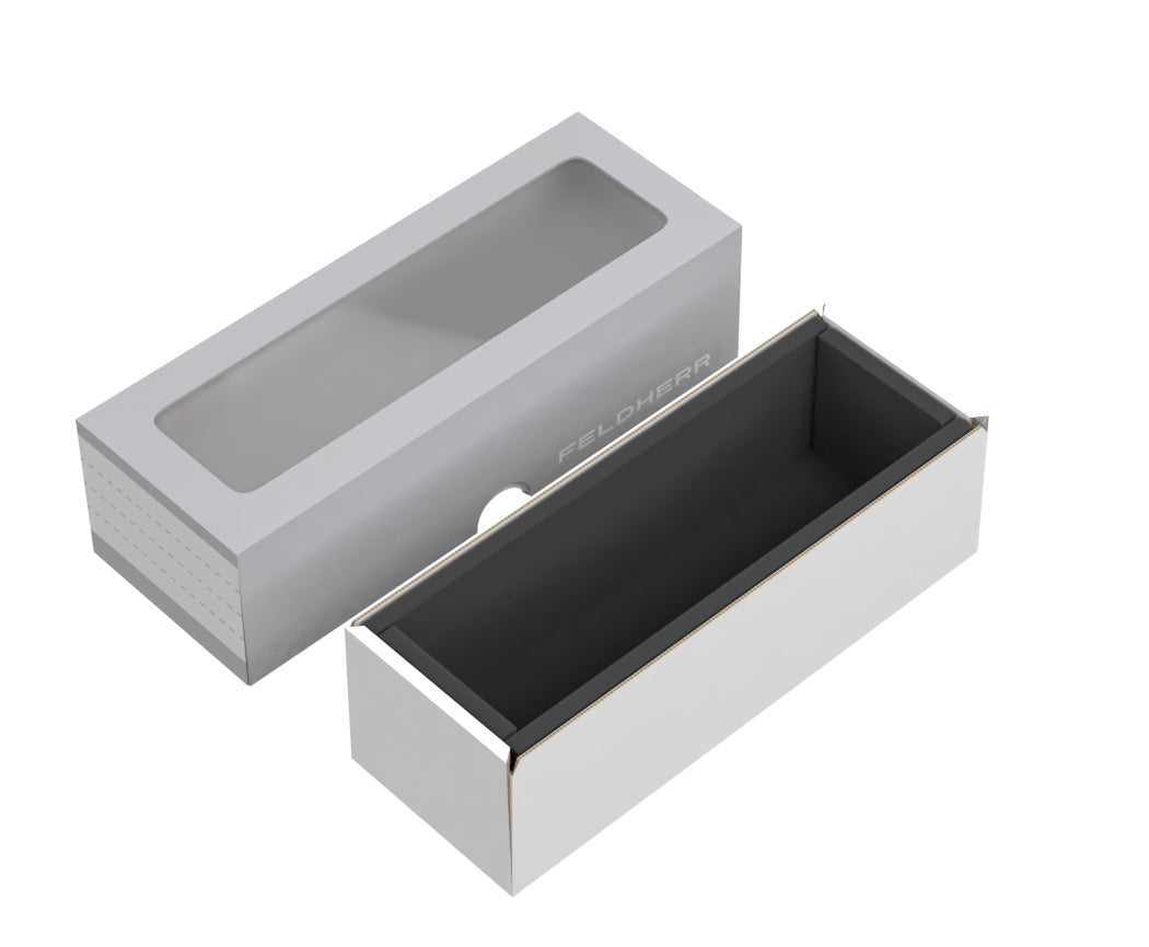 La scatola pieghevole è composta da due parti - una parte inferiore in cartone rivestito grigio, e un coperchio in cartone rivestito colorato con finestra trasparente.