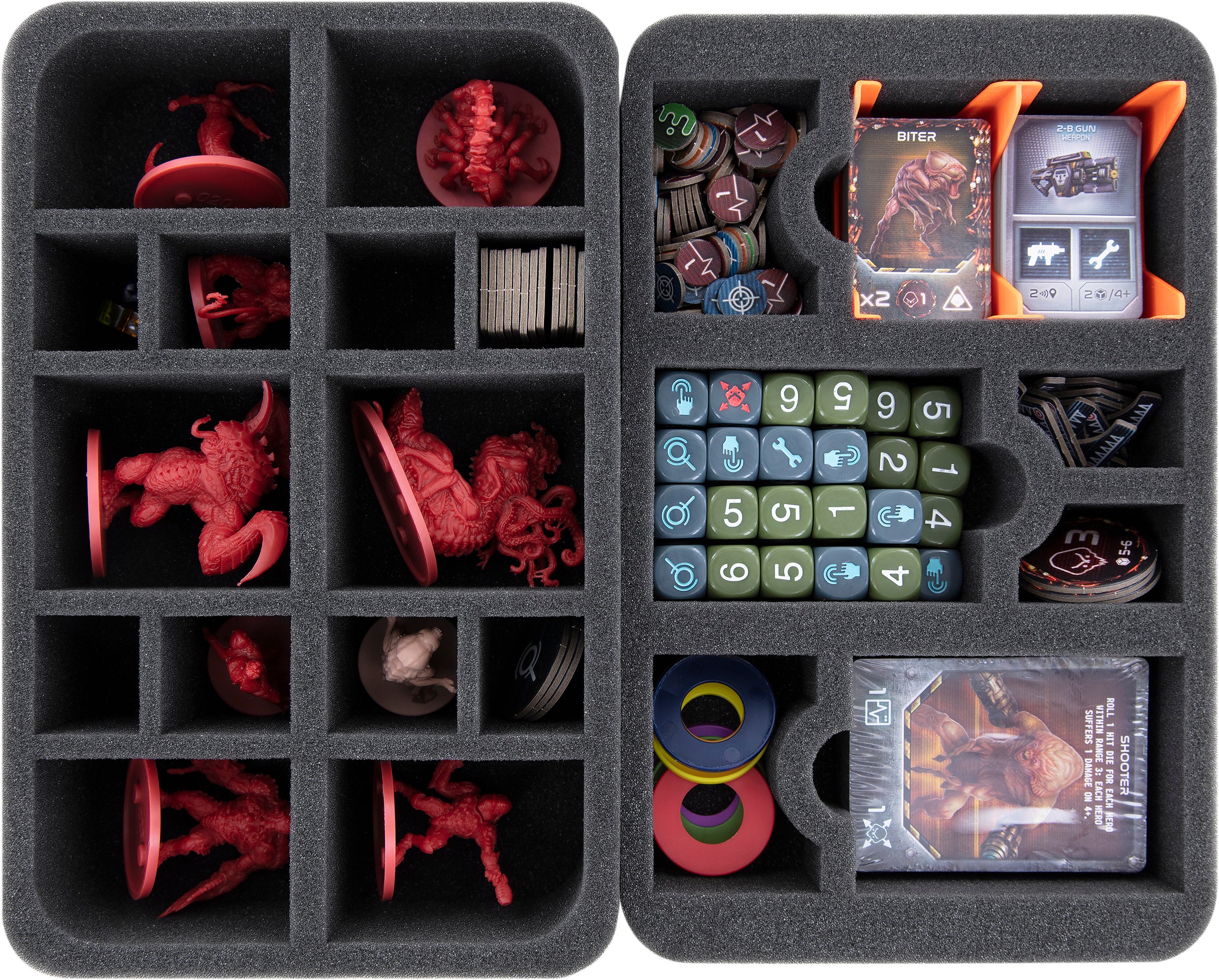 Gli inserti individuali con scomparti speciali per carte, dadi, tessere e gettoni vi aiutano a mantenere il vostro materiale di gioco sempre compatto, organizzato e sicuro. Tieni traccia del tuo materiale di gioco, risparmi tempo durante l'impostazione del gioco e puoi Concentrarsi sulle cose importanti della vita: caricare, mirare, sparare e raccogliere scalpi alieni. Ricordate sempre: L'unico alieno buono è un alieno morto.