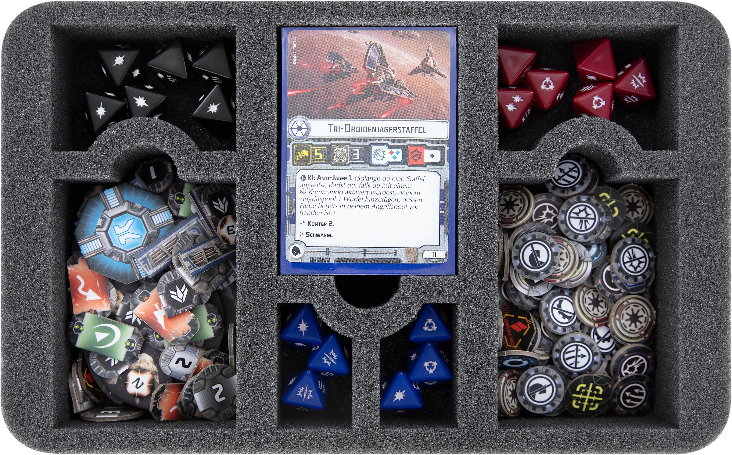 Per stivare gli squadroni V-19-Torrent del Fleet Starter e le 8 miniature dell'Armada Expansion Pack "Republic Fighter Squadrons Expansion Pack" troverete gli scomparti corrispondenti sul secondo inserto di schiuma. Ognuna delle 12 miniature degli squadroni, comprese le basi, ha qui il proprio scomparto.