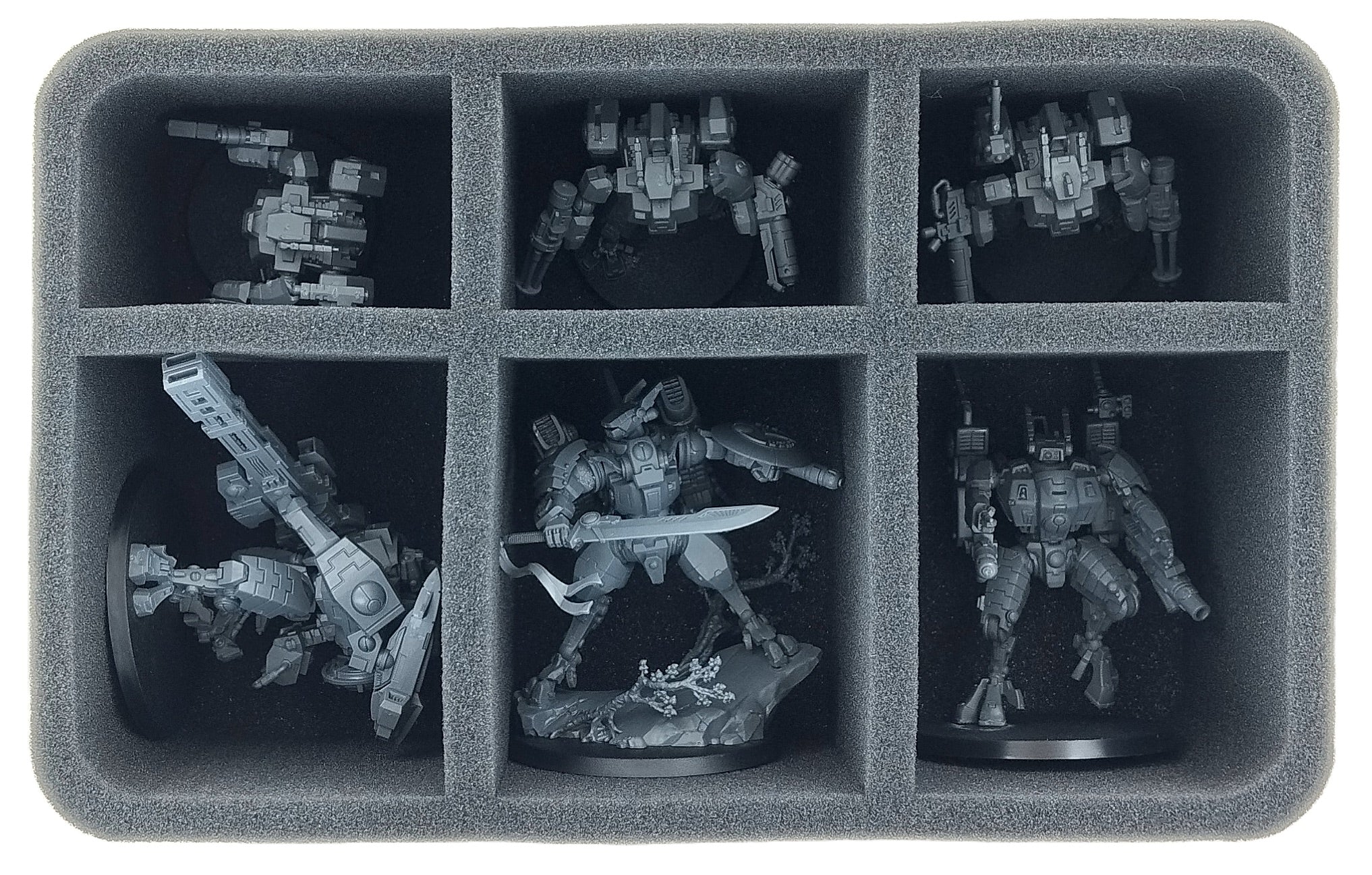 Questo Feldherr Vassoio per schuma offre spazio per un massimo di 6 miniature del vostro esercito. L'inserto è particolarmente adatto per conservare modelli come Commander Farsight, XV88 Broadside Battlesuits, XV8 Crisis Battlesuits e modelli di dimensioni simili.