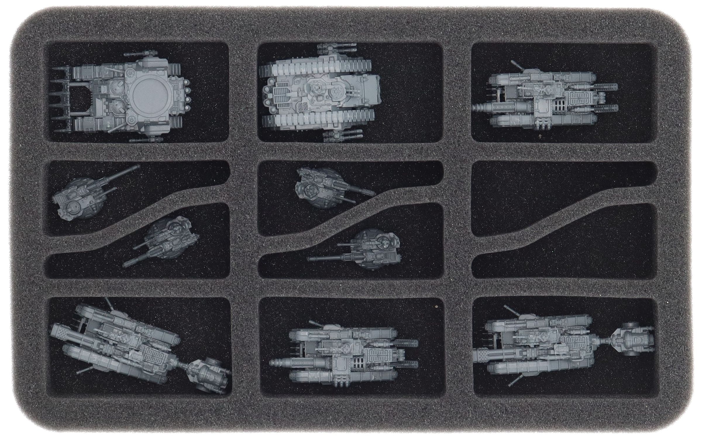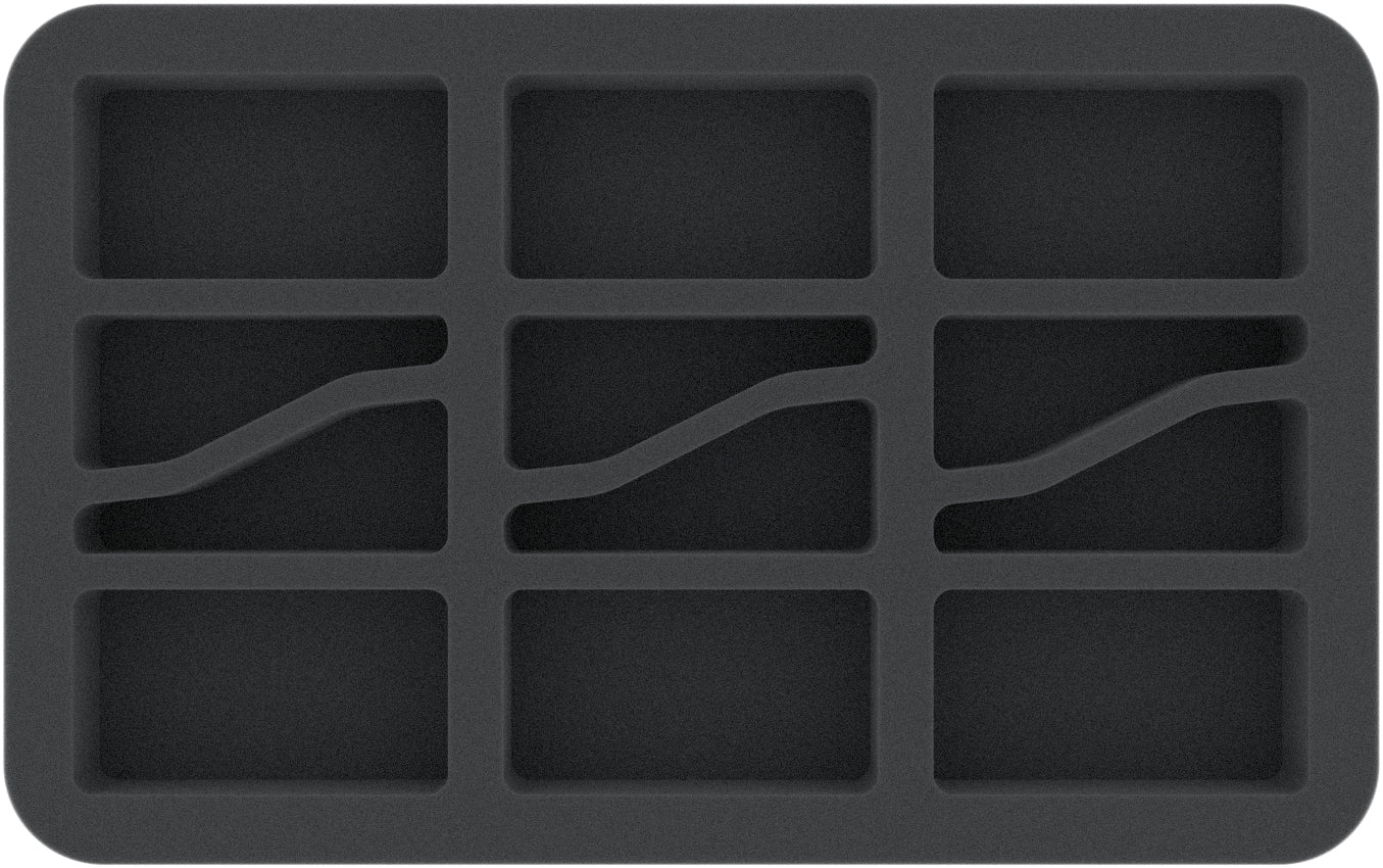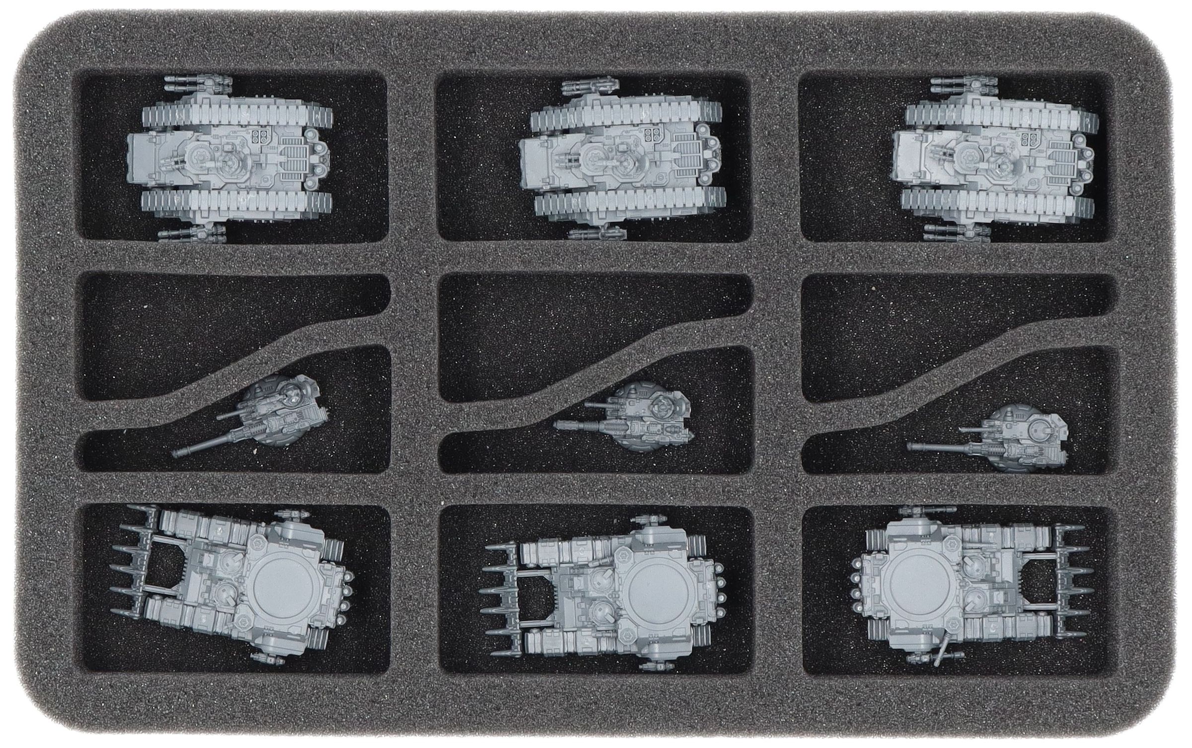 Questo Feldherr Half-Size Vassoio per schuma offre spazio per un massimo di 6 miniature del vostro esercito. L'inserto è particolarmente adatto per conservare miniature di grandi carri armati come il Kratos, Spartan Asssault Tanks, Malcador Infernus, Valdor Tank Destroyer e modelli di dimensioni simili.