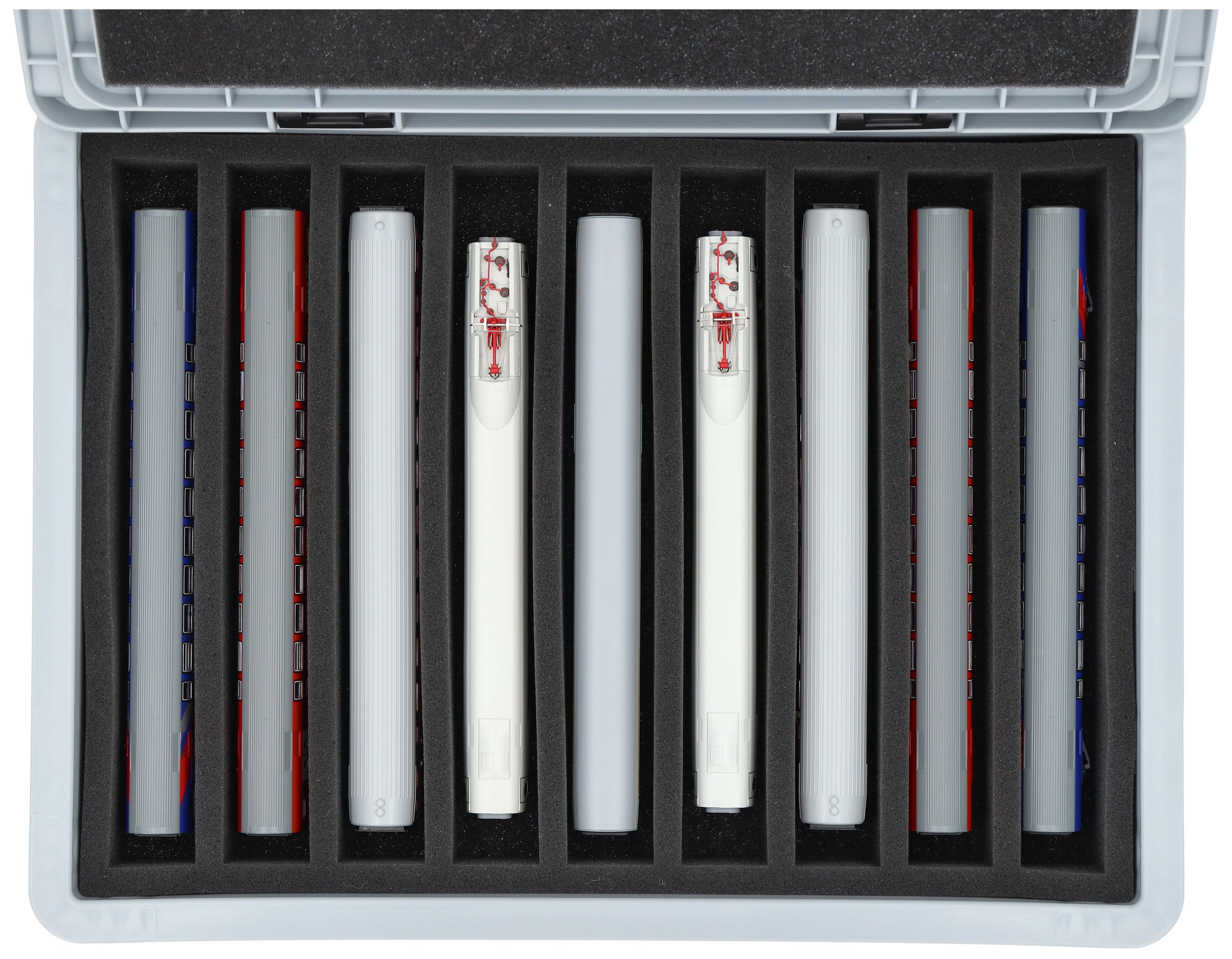 I 9 scomparti di dimensioni uguali (ciascuno lungo circa 250 mm x largo 30 mm x profondo 40 mm) sono stati progettati appositamente per i modelli in scala TT. A seconda della loro lunghezza, è possibile affiancare più vagoni o locomotive. L'adattamento esatto garantisce che i modelli siano fissati saldamente e non scivolino durante il trasporto.
