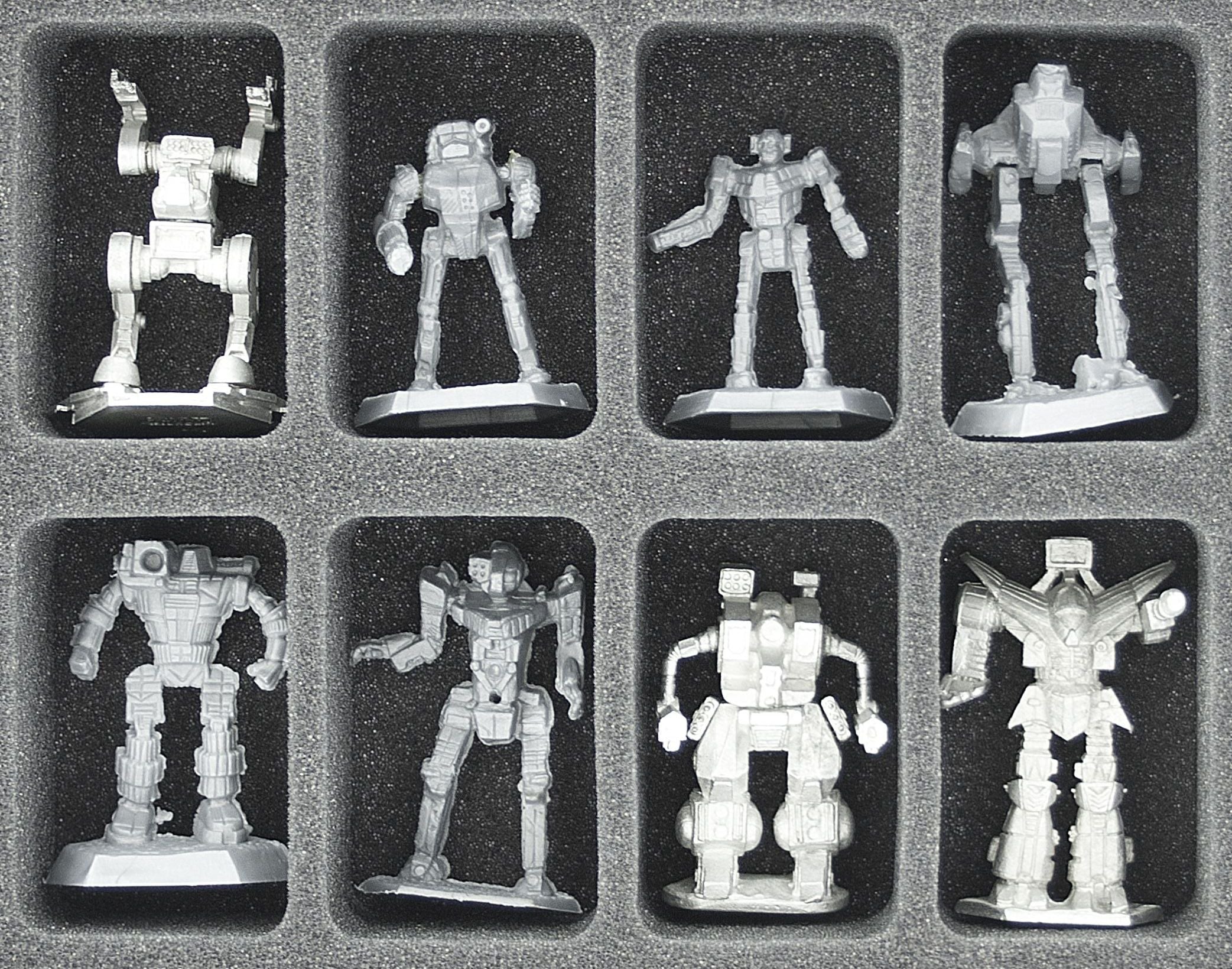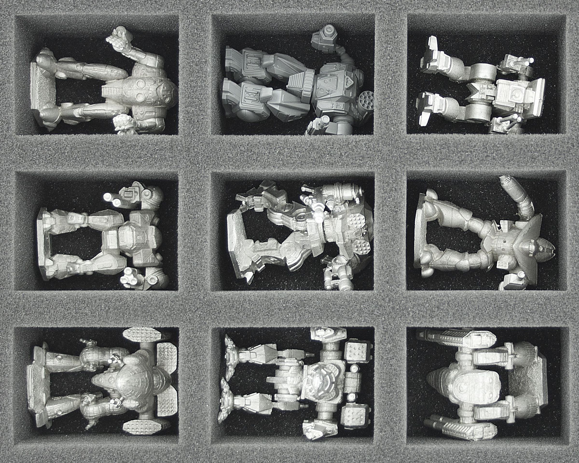 Mech leggermente più grandi su basi fino a 40 mm possono essere riposti nel vassoio di schiuma con 25 scomparti: