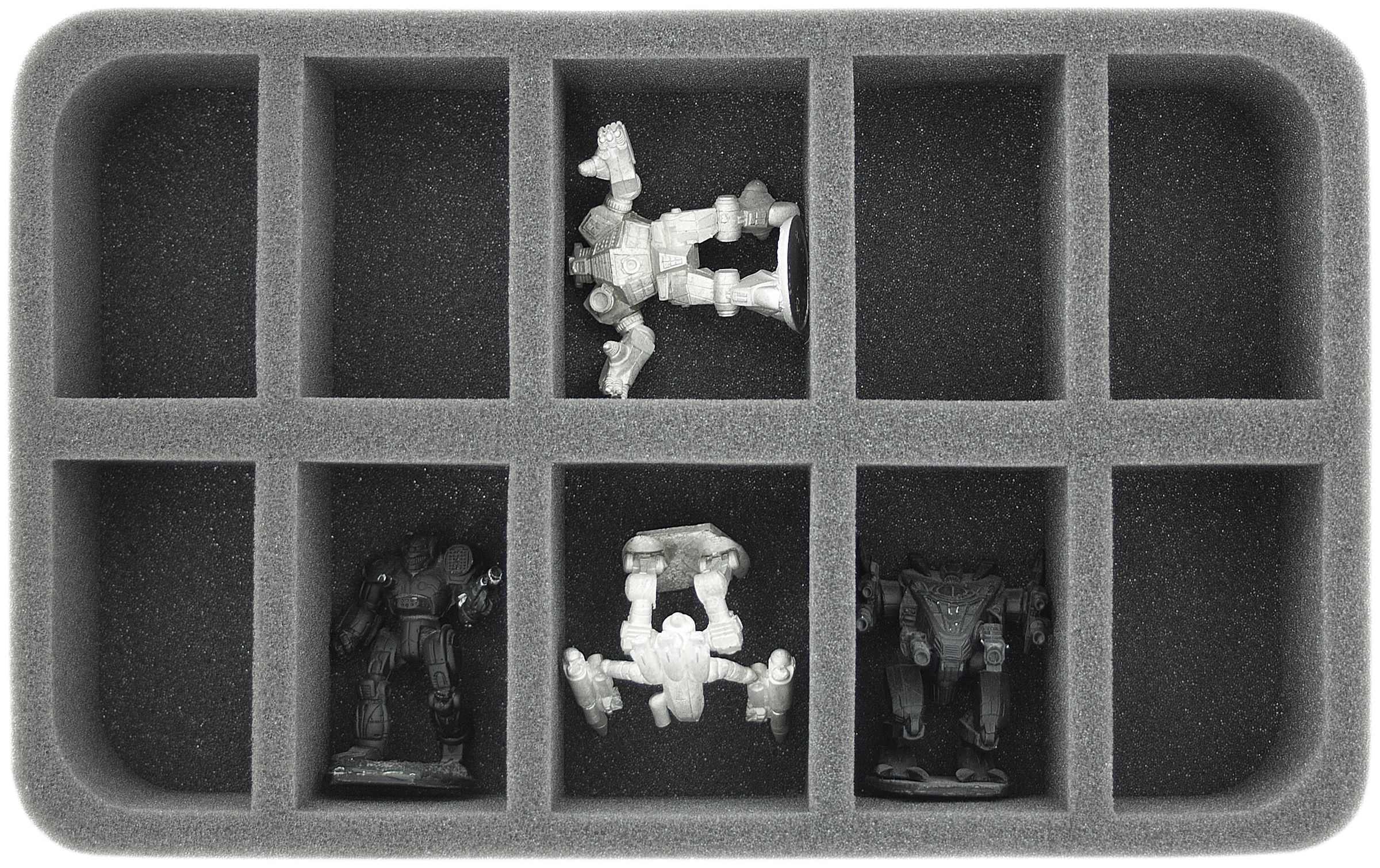 I 2 vassoi in schiuma con 10 scomparti ciascuno sono adatti per i Mech di grandi dimensioni e possono contenere fino a 4 lance, accessori inclusi.