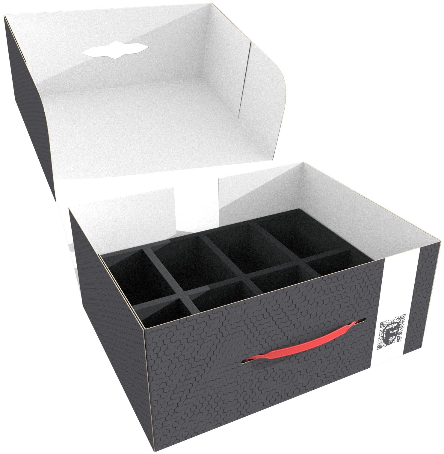 La FSLB150 è realizzata in cartone rivestito a doppia parete. Questo lo rende non solo piacevolmente leggero, ma anche particolarmente resistente allo strappo e stabile. Con i relativi vassoi in schiuma, le miniature e il materiale di gioco possono essere conservati in modo sicuro e protetto dalla polvere e possono essere trasportati senza problemi anche con la maniglia di plastica per il trasporto.