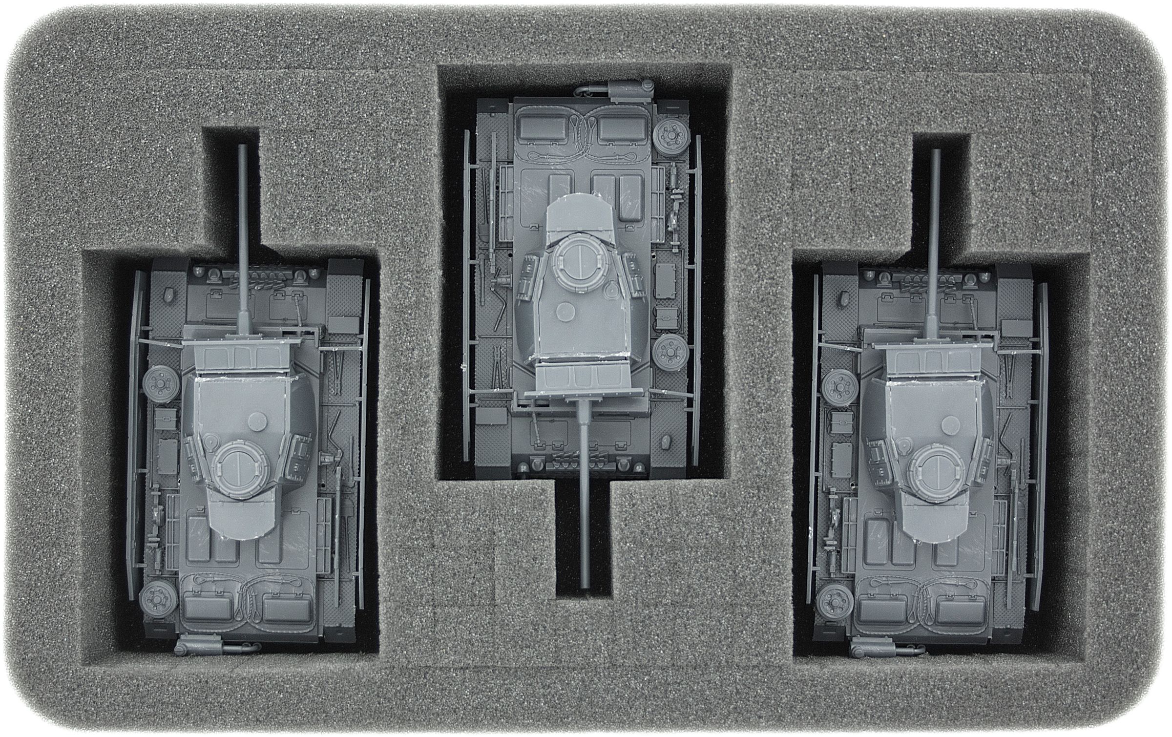 Non appena terminata la configurazione degli scomparti, basta tirare la pellicola dal vassoio e incollare la base in schiuma ad esso. I vostri carri armati sono ora al sicuro da cadute.