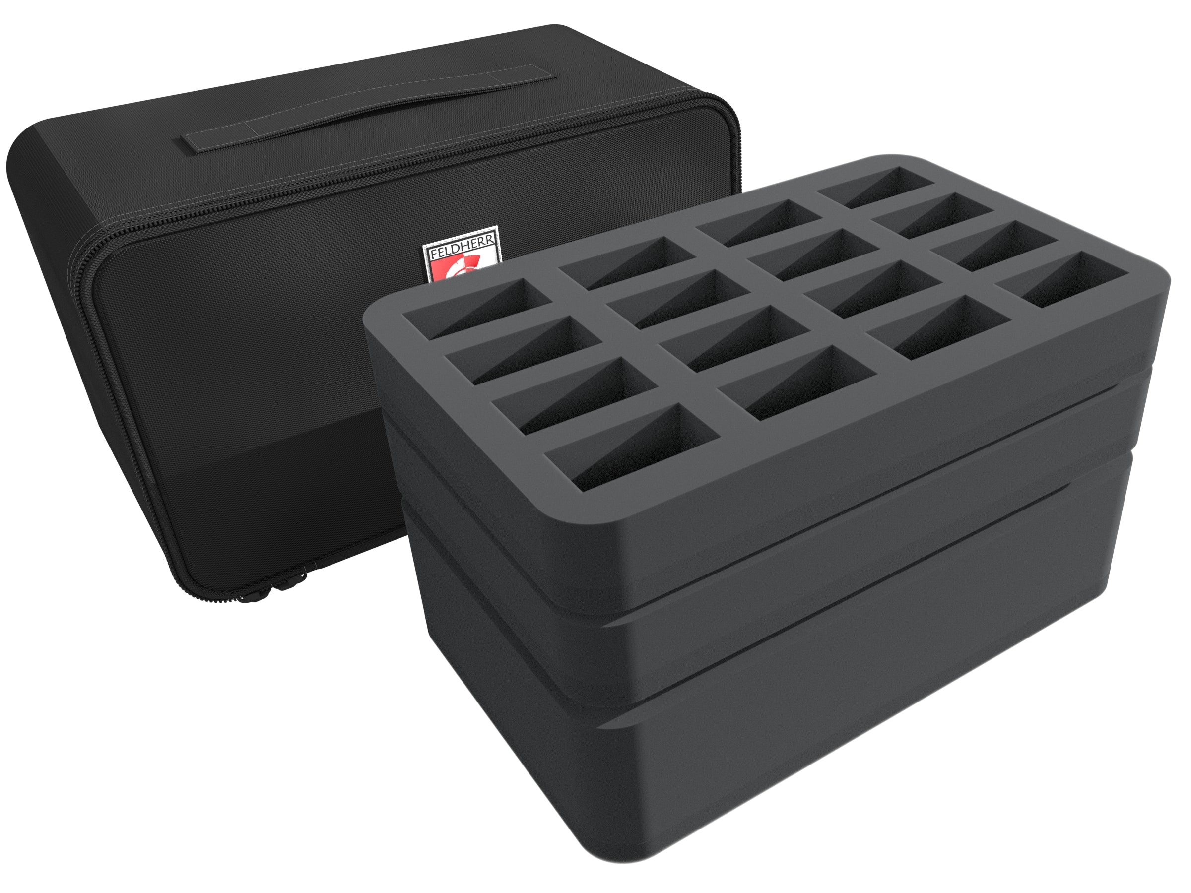 Gli scomparti per i soldati hanno le stesse dimensioni. Ciascuno dei 32 scomparti è lungo 50 mm di lunghezza x 25 mm di larghezza x 25 mm di profondità. I vassoi sono quindi ideali per contenere i modelli su basi da 25 mm. Circondati da una schiuma a pori fini, i vostri soldati sono ben protetti da graffi e parti rotte.