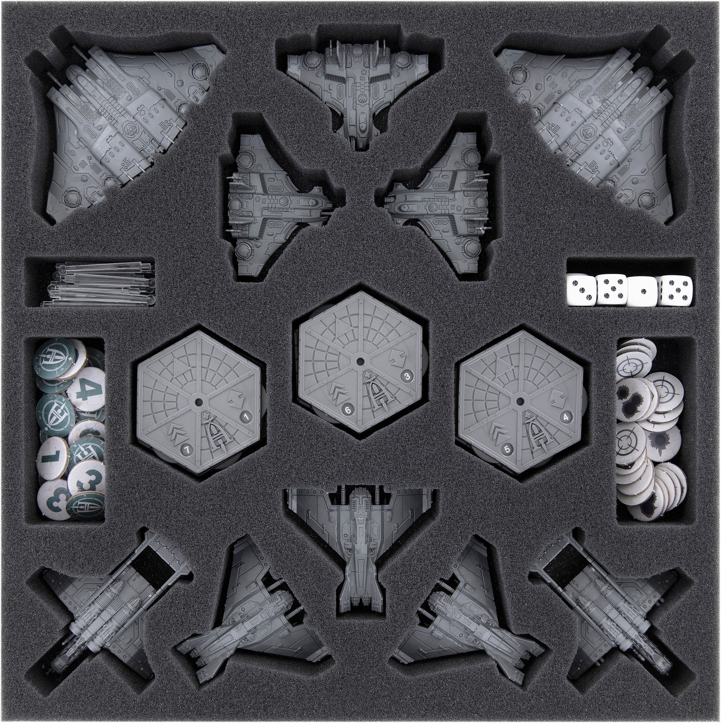 Tre scomparti esagonali ospitano le Basi dell'Aeronautica Imperialis. I supporti in plastica hanno il loro scomparto. I dadi possono essere collocati nello scomparto opposto. Ordinare i gettoni negli altri due scomparti.