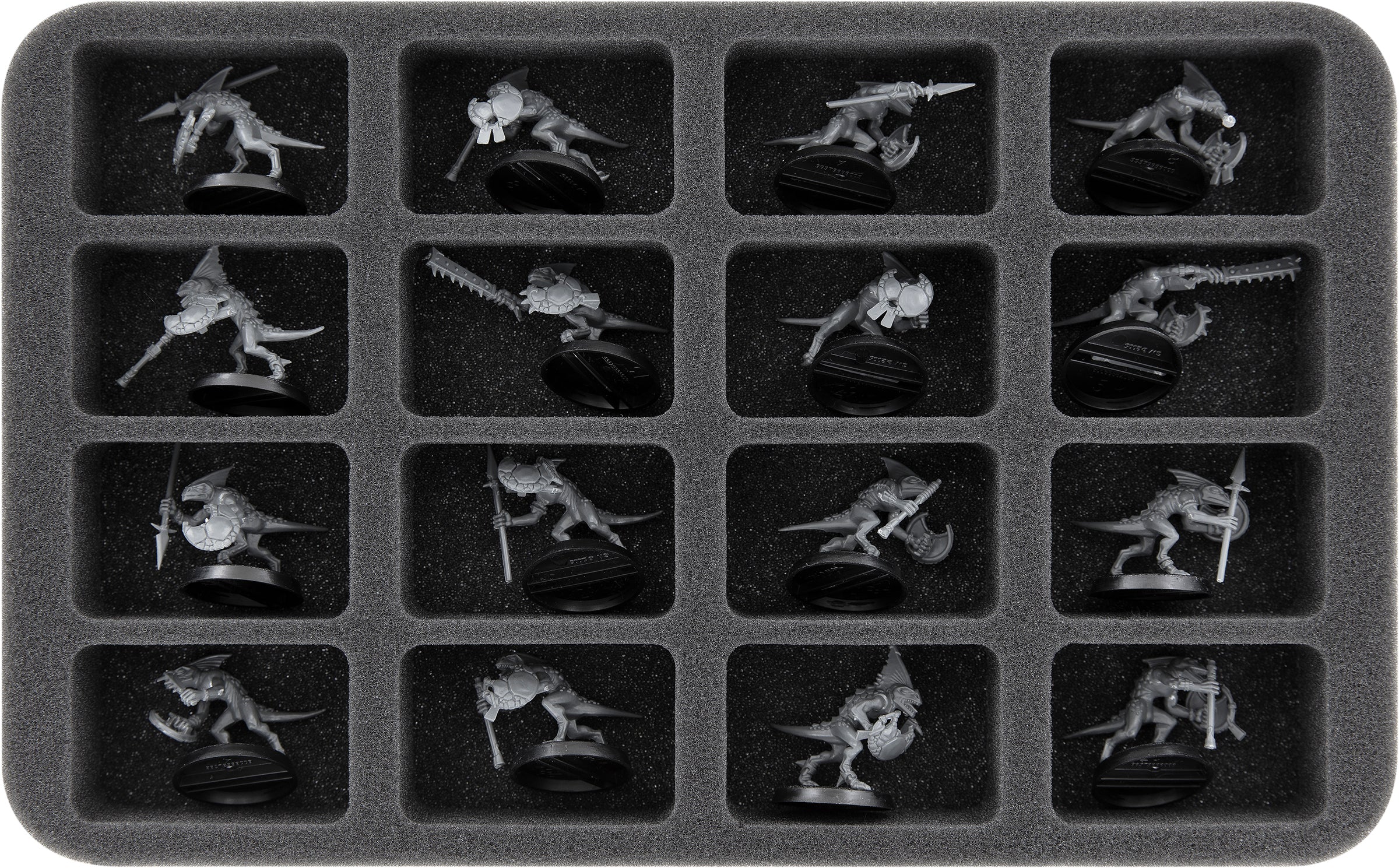 Su questo vassoio in schiuma Feldherr hai spazio per un massimo di 16 miniature del tuo esercito. L'inserto è particolarmente adatto per riporre i guerrieri Saurus, gli Skinks e modelli di dimensioni simili.
