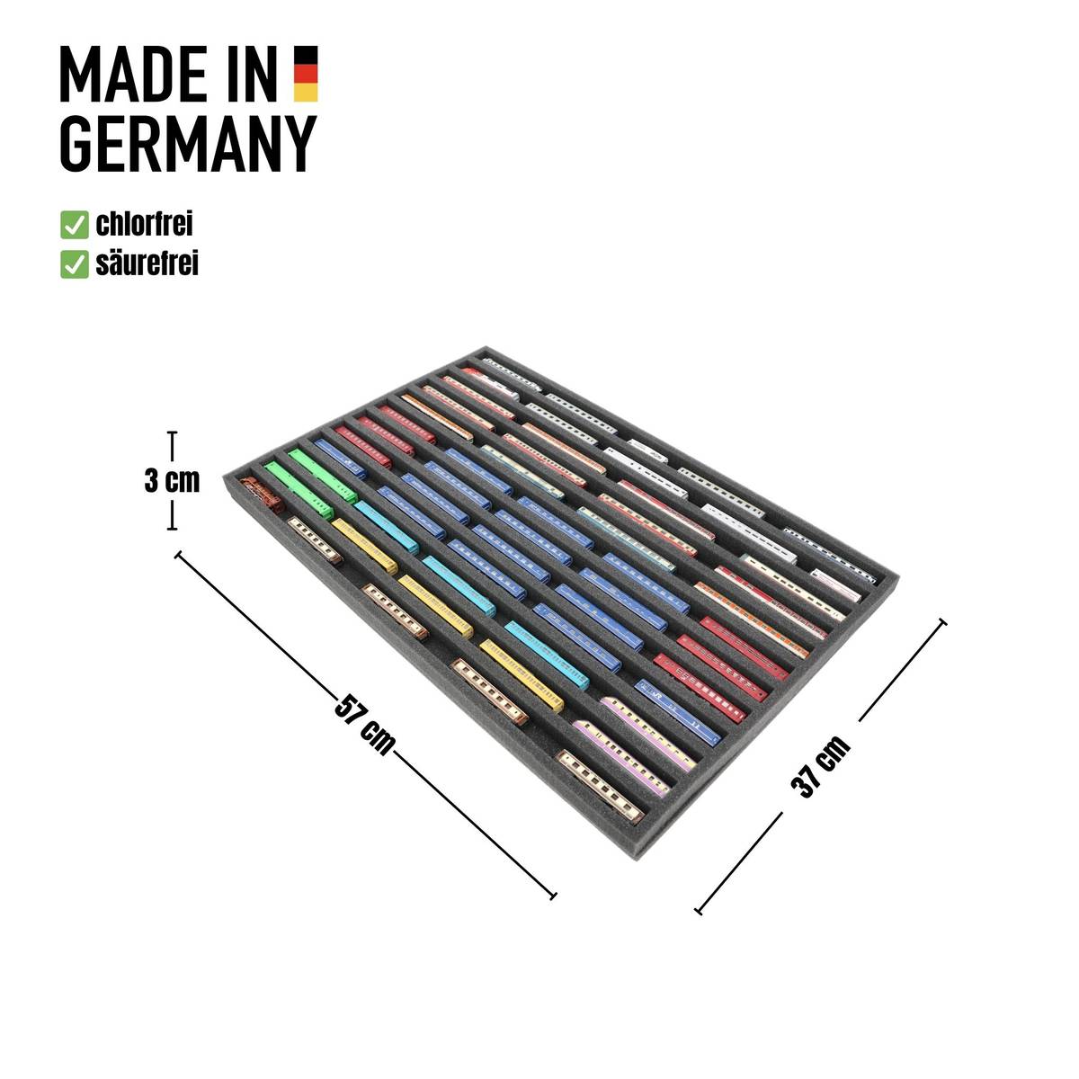 Die Schaumstoffeinlage hat die Maße: 570 mm x 370 mm x 30 mm Gesamthöhe (20 mm Nutzungshöhe + 10 mm Schaumstoffboden).