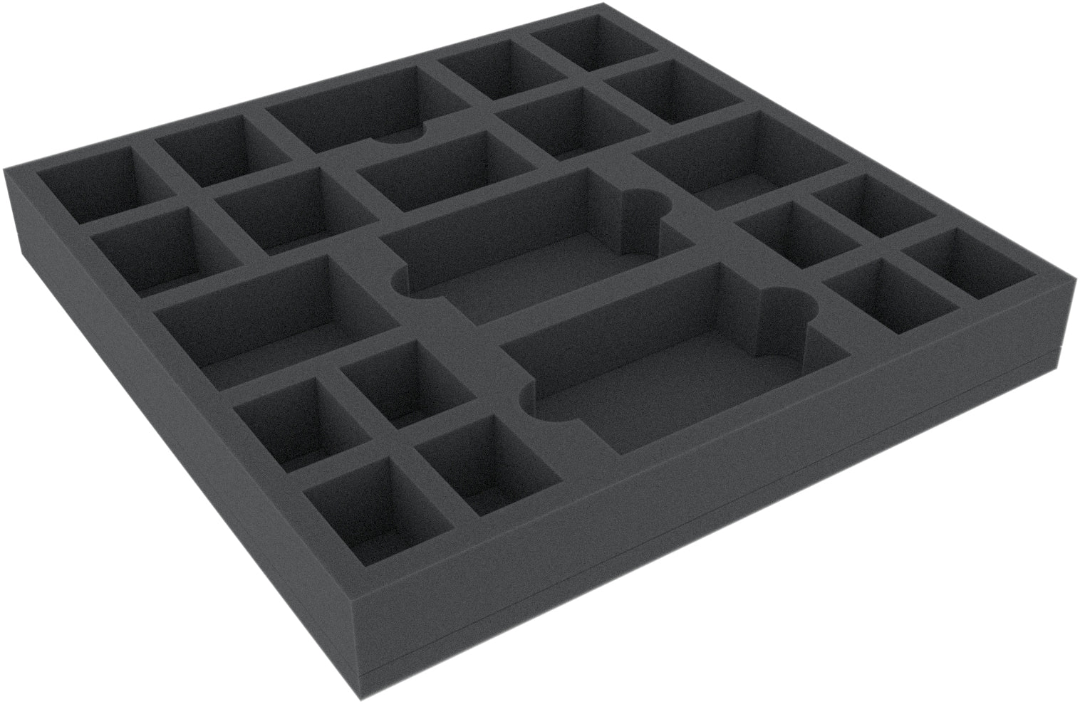 Taca piankowa podzielona jest na 22 przedziały o różnych rozmiarach. Szczególnie nadaje się jako wkładka do bezpiecznego przechowywania miniatur i materiałów do gry w oryginalnych pudełkach do gier planszowych (np. z CMON, Corvus Belli).