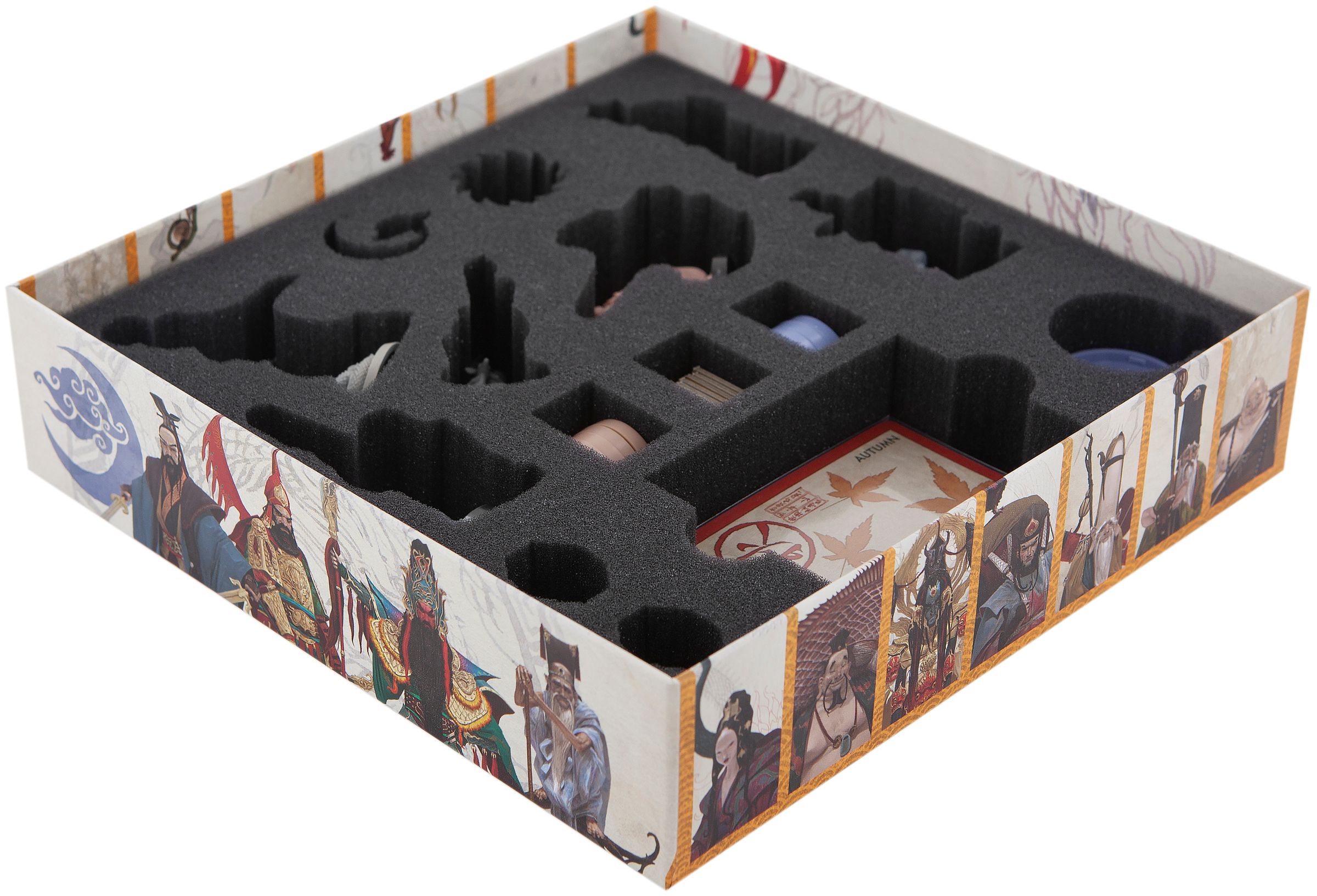 Każda miniatura ma swój indywidualny kształt w piance. Komory są specjalnie zaprojektowane dla miniatur Inwazji Dynastii. Taca z pianki idealnie pasuje do pudełka. Piana rozciąga się na krawędź pudełka z grami planszowymi.