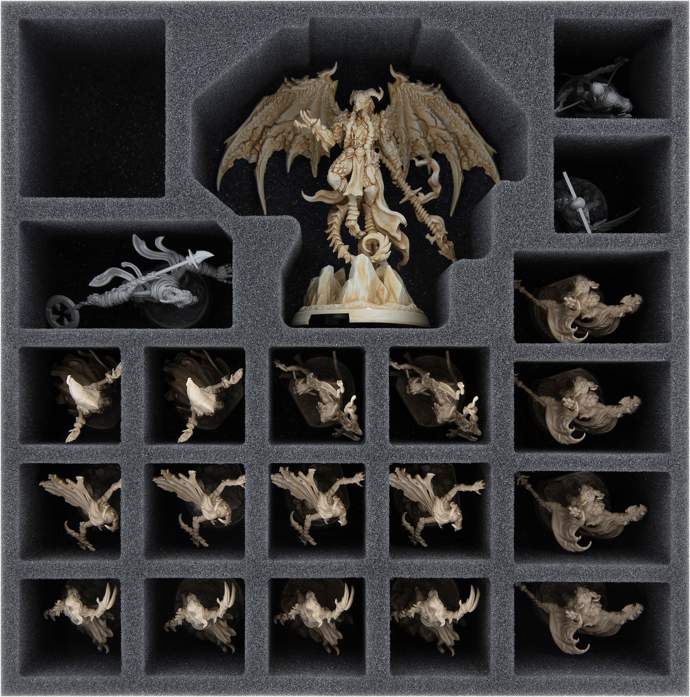 - Dwie piankowe tacki zapewniają niezawodną ochronę dla miniatur. Wkładki są umieszczone w oryginalnej tekturowej wkładce w dolnym pudełku.