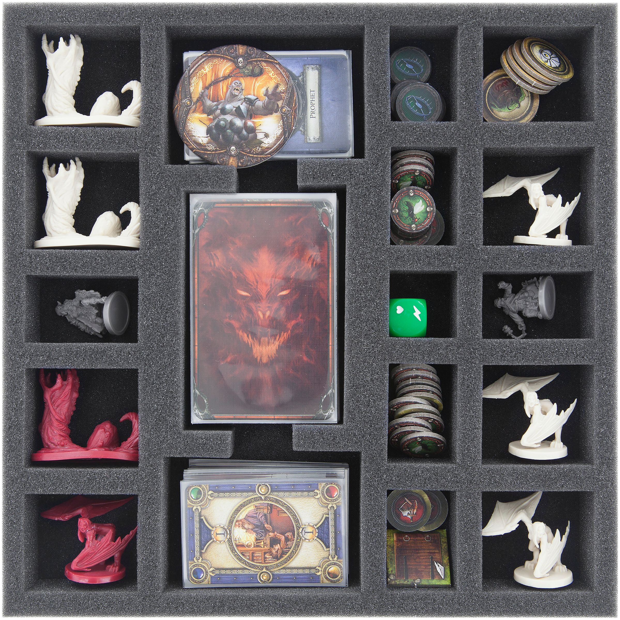 Karty do gry mogą być sortowane na dwa przedziały o różnych rozmiarach. Jedna komora jest zarezerwowana dla Green Power Die. Żetony mogą być rozłożone na pozostałe sześć szczelin. Zapewni to szybki przegląd sytuacji i zaoszczędzi trochę czasu przy ustawianiu gry. Pod pianką znajdują się płytki mapy. Na pokrywie z pianki można umieścić Zestaw Zasad/Księgę przewodnika wraz z Arkuszami Bohaterów. Powoduje to nieznaczne wydłużenie pokrywy pudełka z grą.
