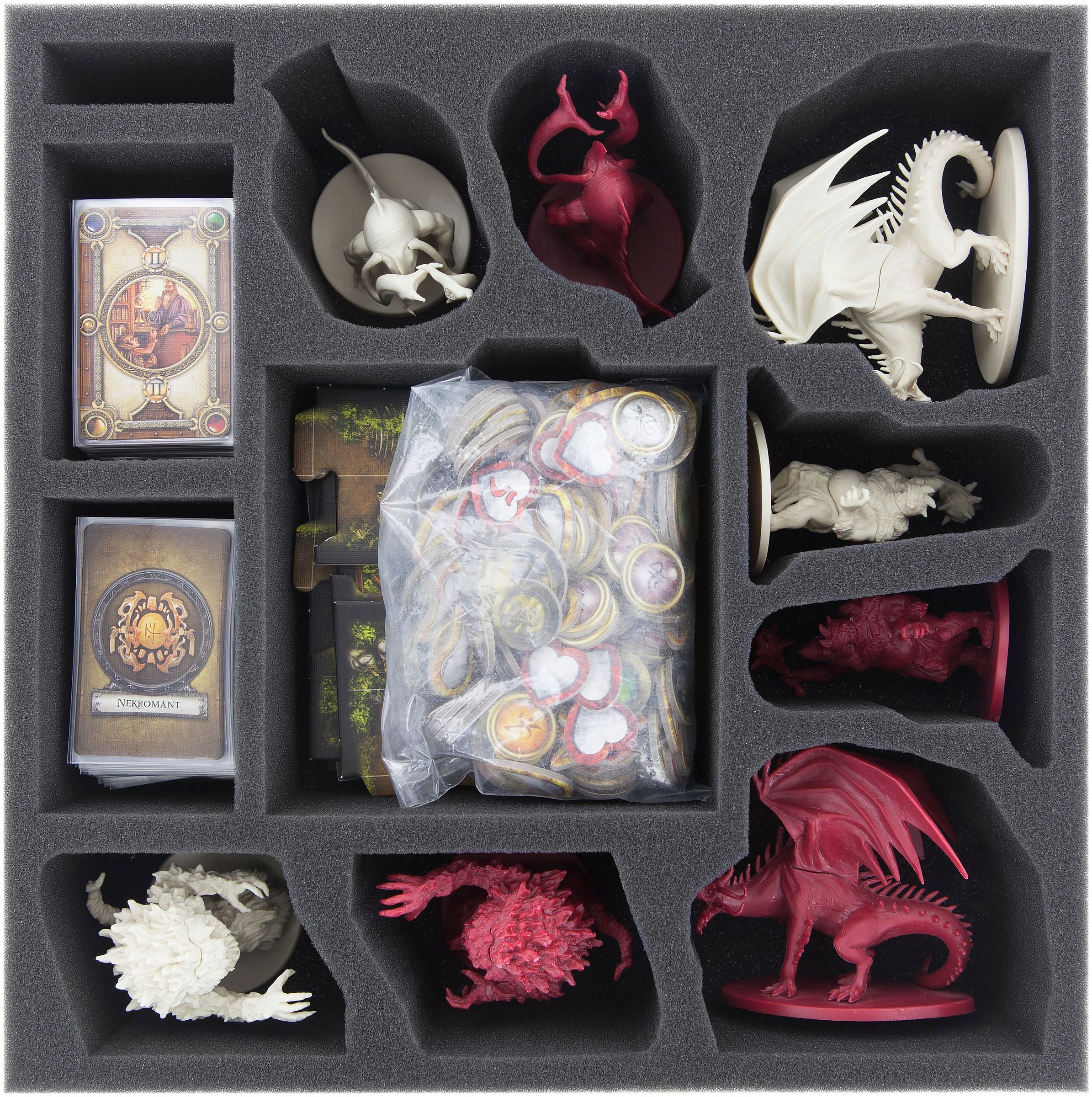 Dolna taca z pianki zapewnia porządek z żetonami i kafelkami. Jedna duża komora na duże kafelki mapy i trzy mniejsze na małe, a także żetony. Czwarta służy do przechowywania plastikowych podstawek, aby się nie zgubiły. się zgubiły. Arkusze bohaterów mogą być tu również bezpiecznie przechowywane. Wreszcie, na piankowej okładce znajduje się Rulebook i Quest Guides.