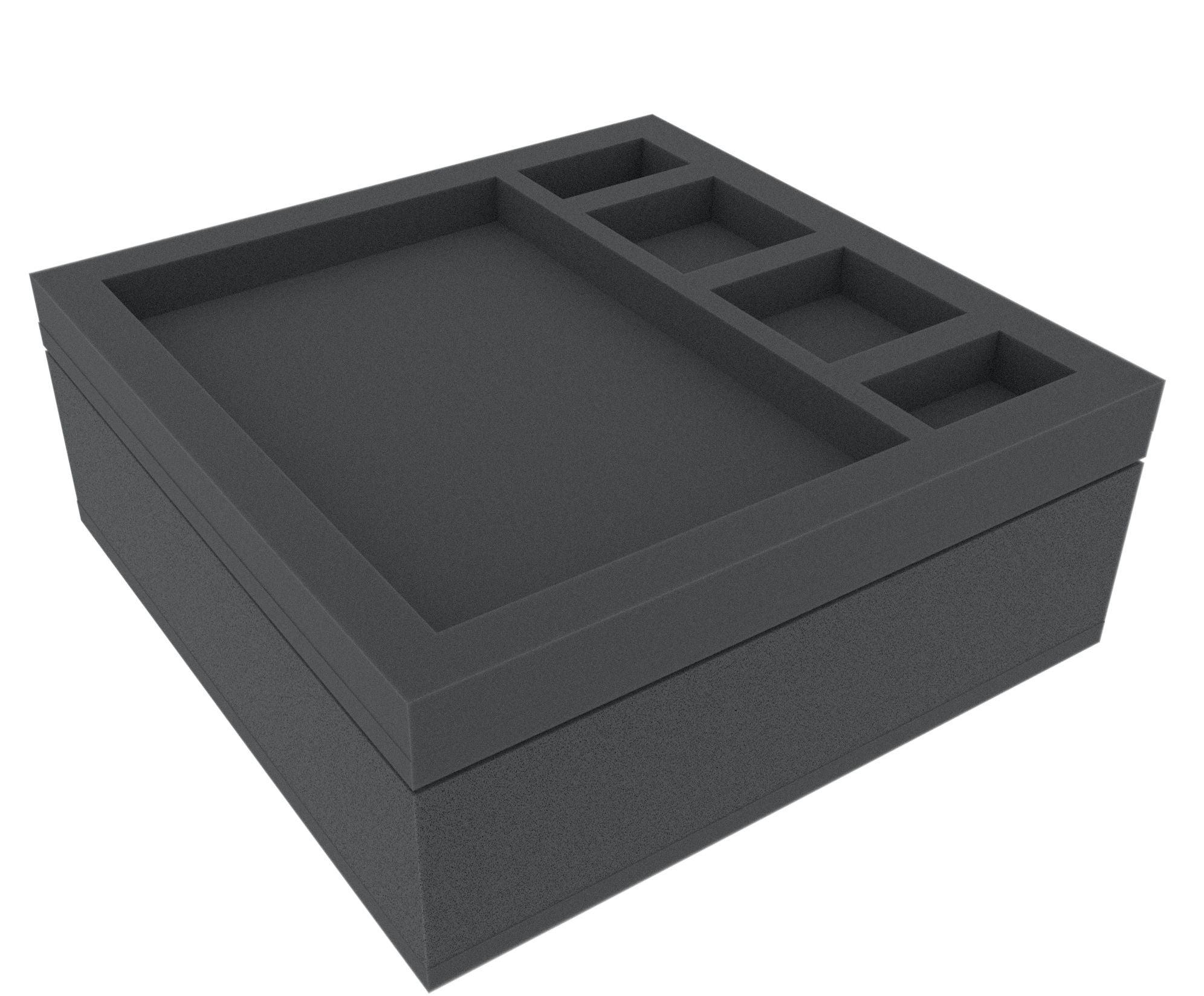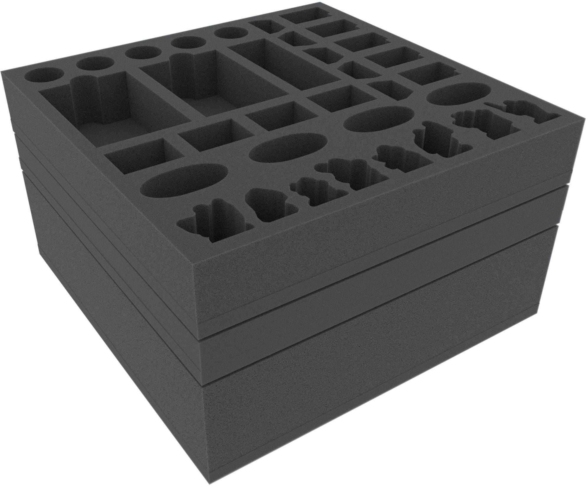 Zestaw składa się z trzech tacek piankowych (wymiary: 285 mm x 285 mm i wysokości 40 mm, 70 mm i 30 mm) oraz jednej nakładki piankowej. Jako materiału używamy wyłącznie wysokiej jakości, bezchlorowej i bezkwasowej pianki. Maty są podzielone na indywidualne przedziały, w których można szybko i łatwo sortować miniatury i komponenty gry. Miniaturowe cięcie przedziałów zapobiega wyginaniu się bardziej wrażliwych części, takich jak broń, pazury czy skrzydła. Oddzielenie figury za pomocą piankowych przegródek zapewnia optymalną ochronę malowanych figur i chroni kolory przed łuszczeniem się.