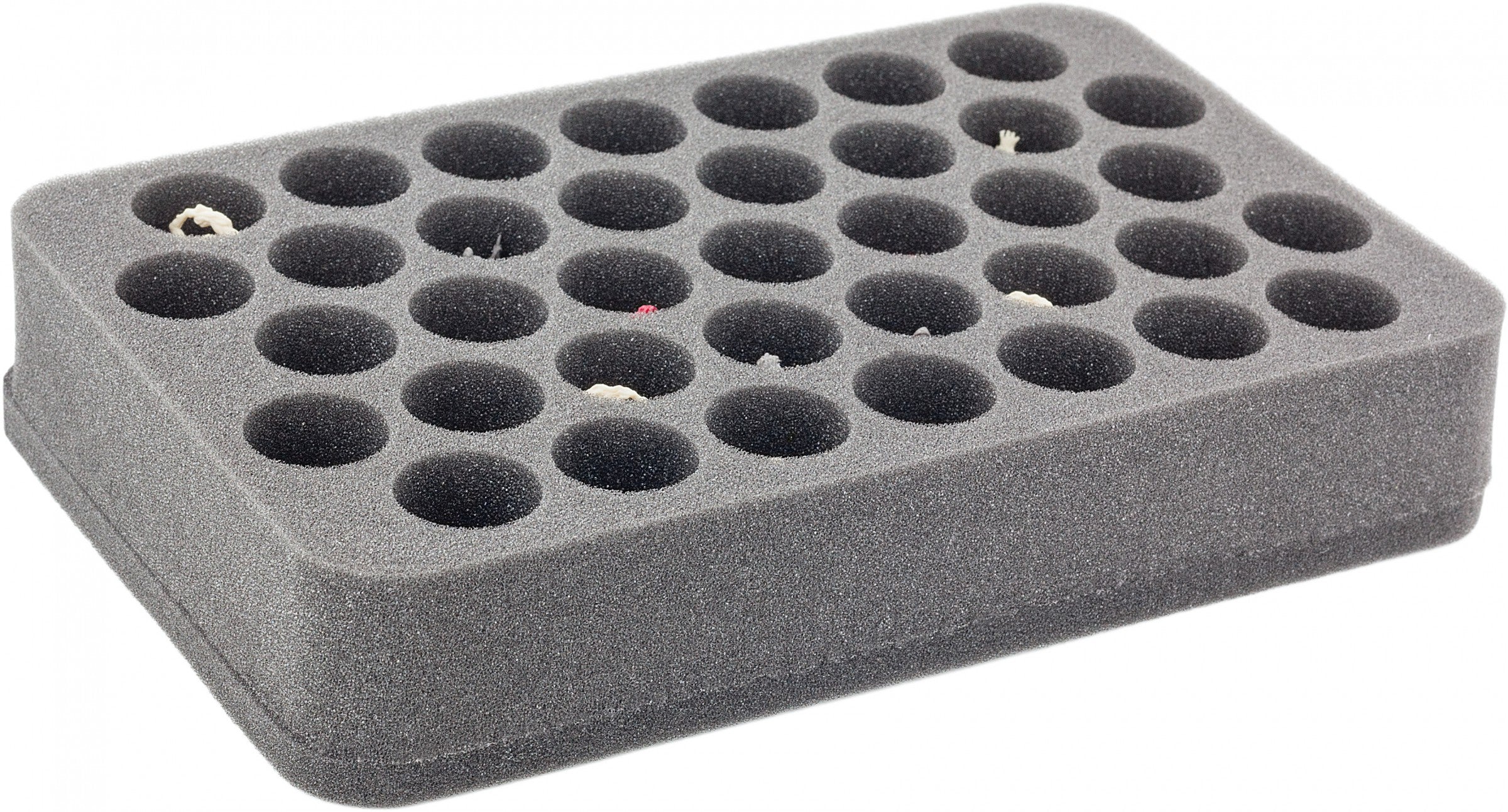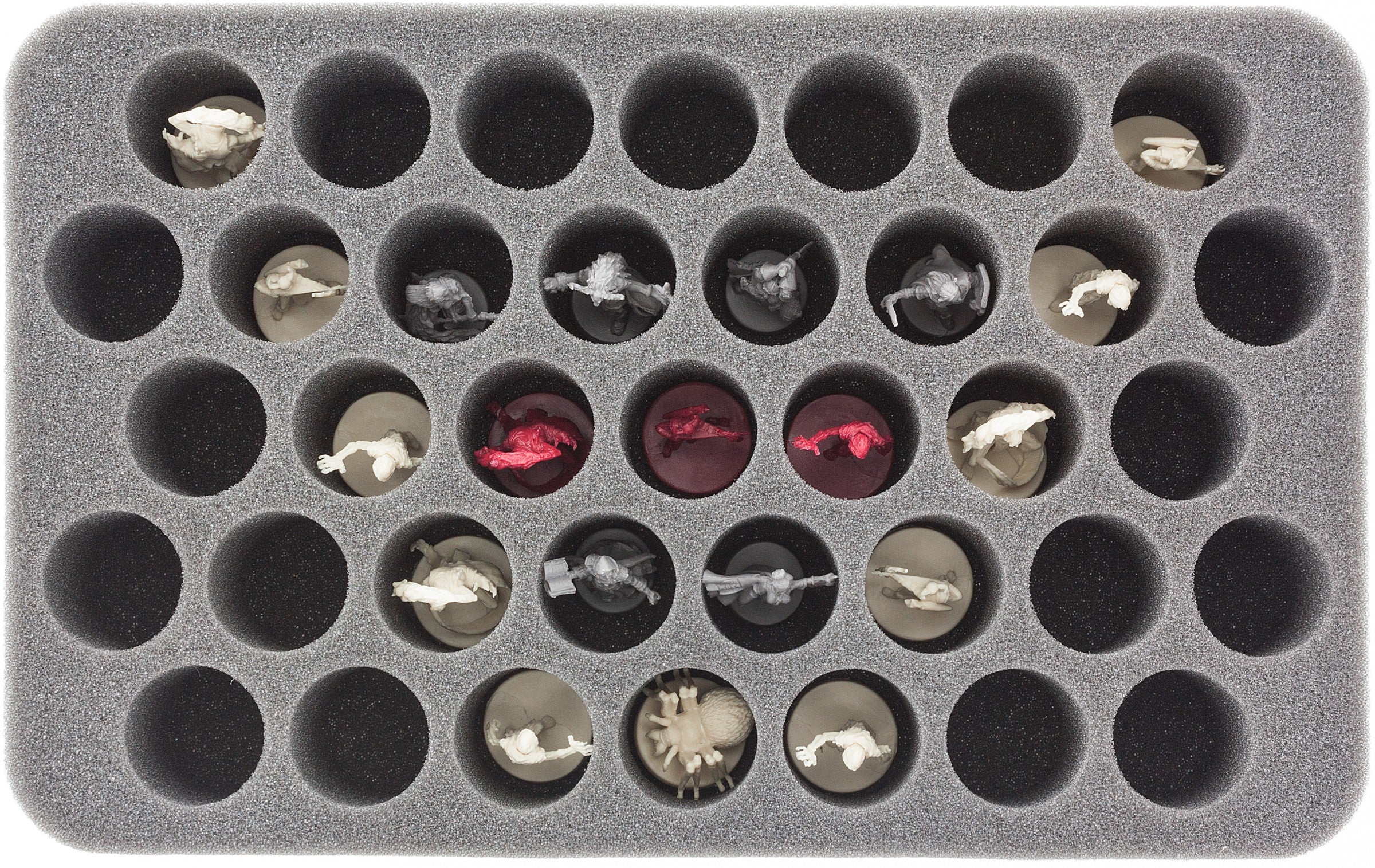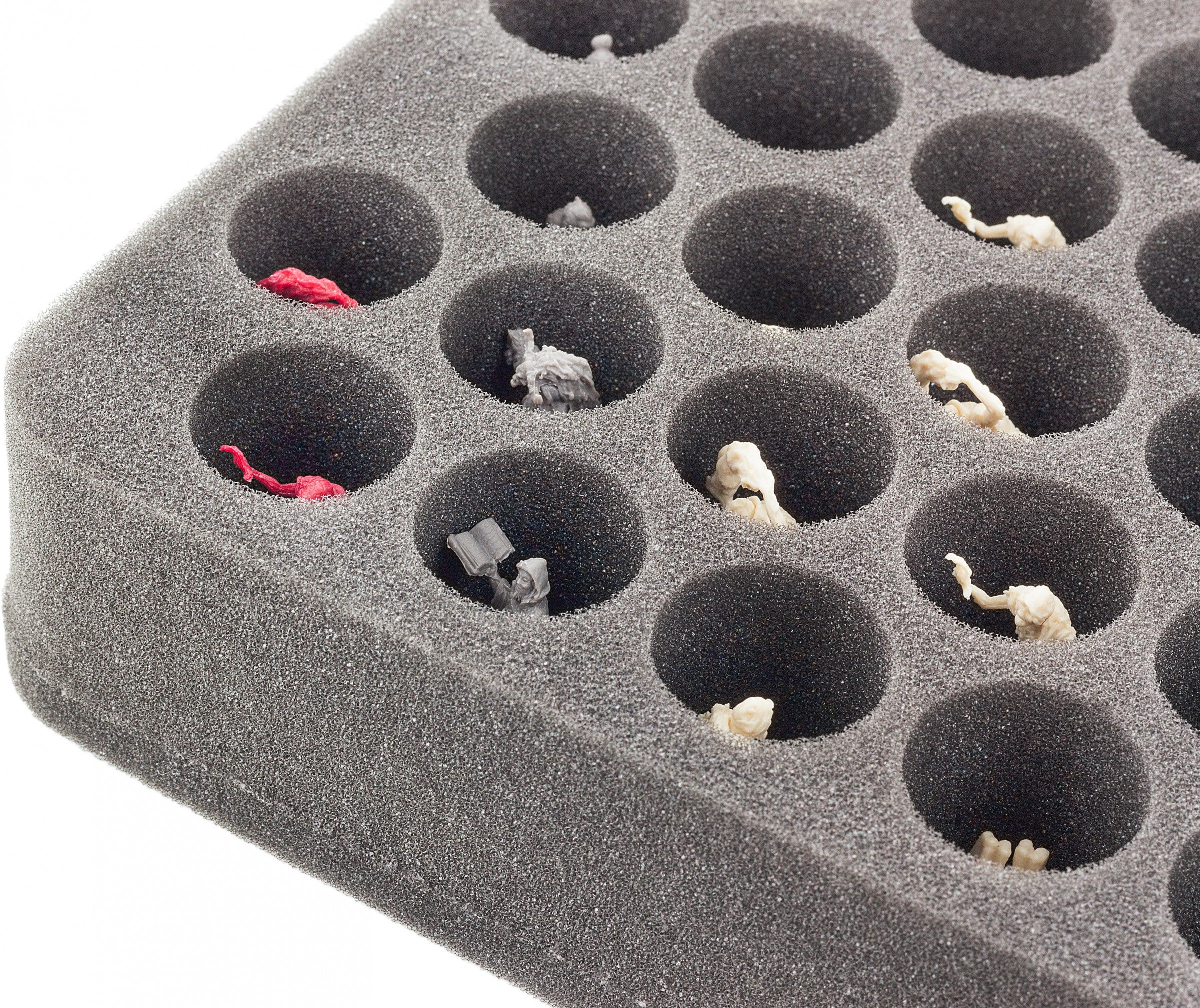 Małe postacie bohaterów i potworów znajdą bezpieczną przystań w 37 bazowych przegrodach. Mają one średnicę 28 mm i efektywną głębokość 40 mm. Dlatego też idealnie nadaje się do ustawiania figur w pozycji stojącej. Dzięki podstawie o grubości 10 mm wkładka osiąga całkowitą wysokość 50 mm.