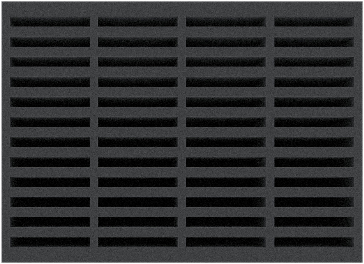- Wymiary piankowej wkładki: 360 mm x 260 mm x 110 mm (wysokość użytkowa: 100 mm + 10 mm podstawa z pianki). 48 wycięć ma wymiary 80 mm x 10 mm x 100 mm.