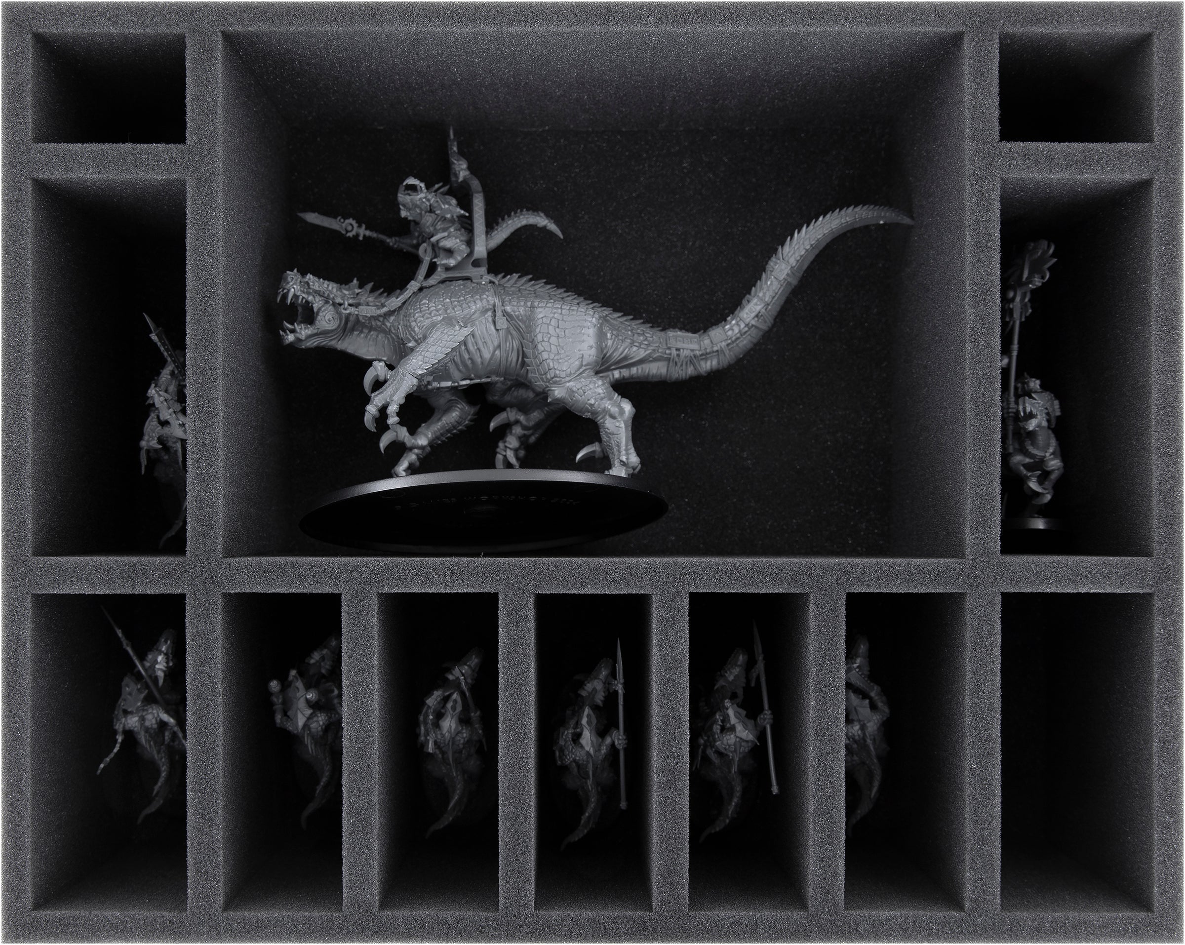 Wkładka posiada dużą przegródkę, w której bezpiecznie przechowywany jest Saurus Oldblood na Carnosaur. Podłużne przegródki można wypełnić na przykład Saurus Knights. W dwóch małych przegródkach masz miejsce na małe modele piechoty, takie jak Saurus Warriors.