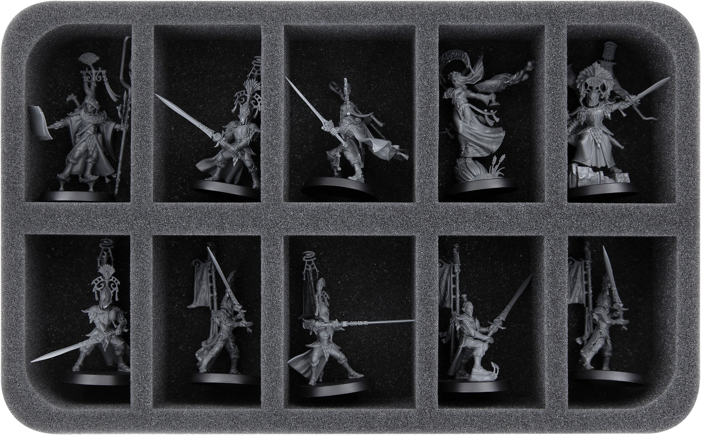 Na tej podstawce z pianki Feldherr masz miejsce na 10 figurek swojej armii. Wkładka nadaje się szczególnie do przechowywania Scinari Loreseeker, Scinari Calligrave, Scinari Cathallar i podobnych rozmiarów modeli.