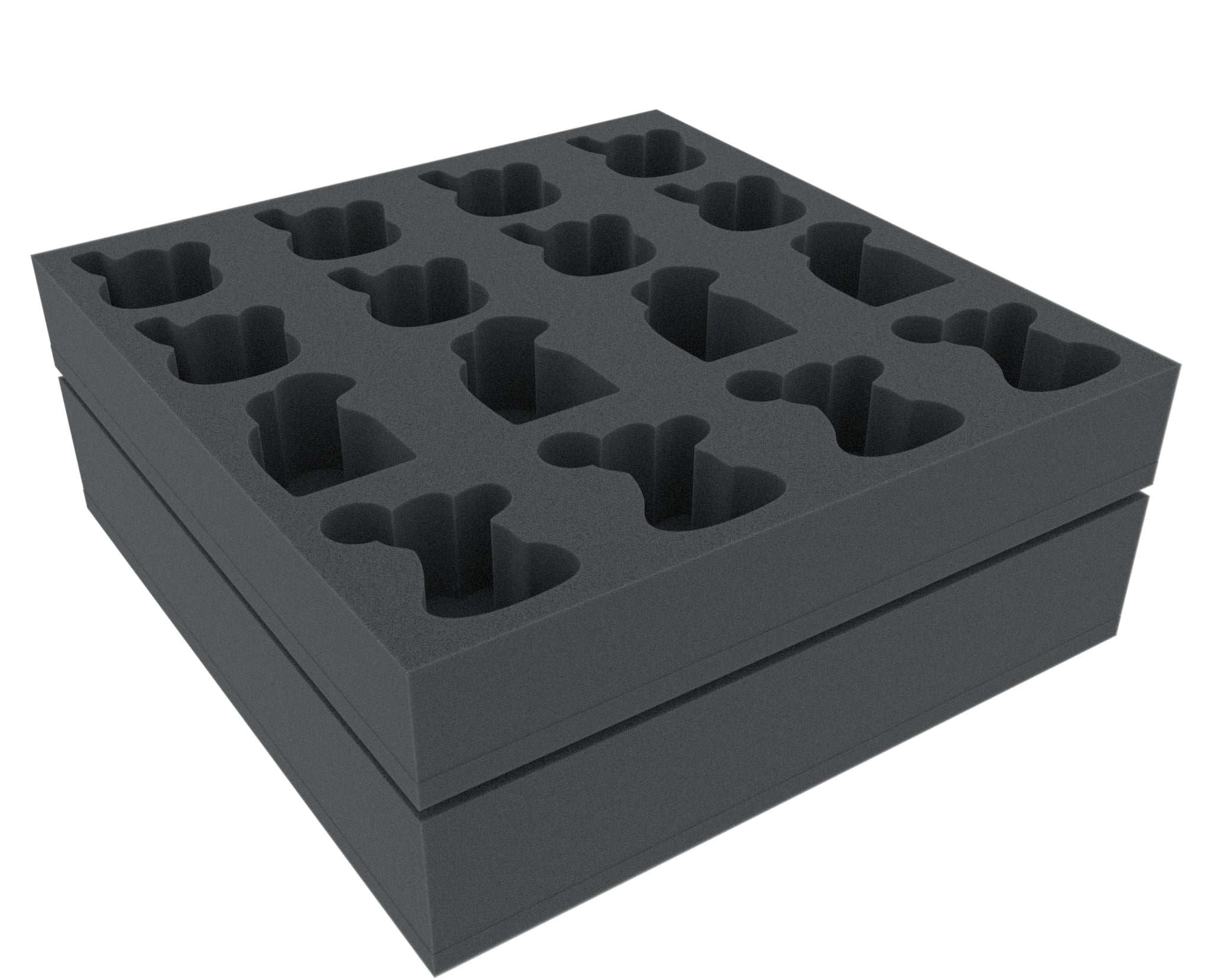 Taca z pianki o wysokości 65 mm z 25 precyzyjnie dopasowanymi przegrodami zapewnia optymalną ochronę Twoich miniaturek. Szczególnie, gdy figury zostały zagruntowane, pomalowane i umyte w godzinach szczegółowej pracy, ważne jest, aby były od siebie oddzielone. Zapobiega to kolizjom i ścieraniu lub łuszczeniu się kolorów.