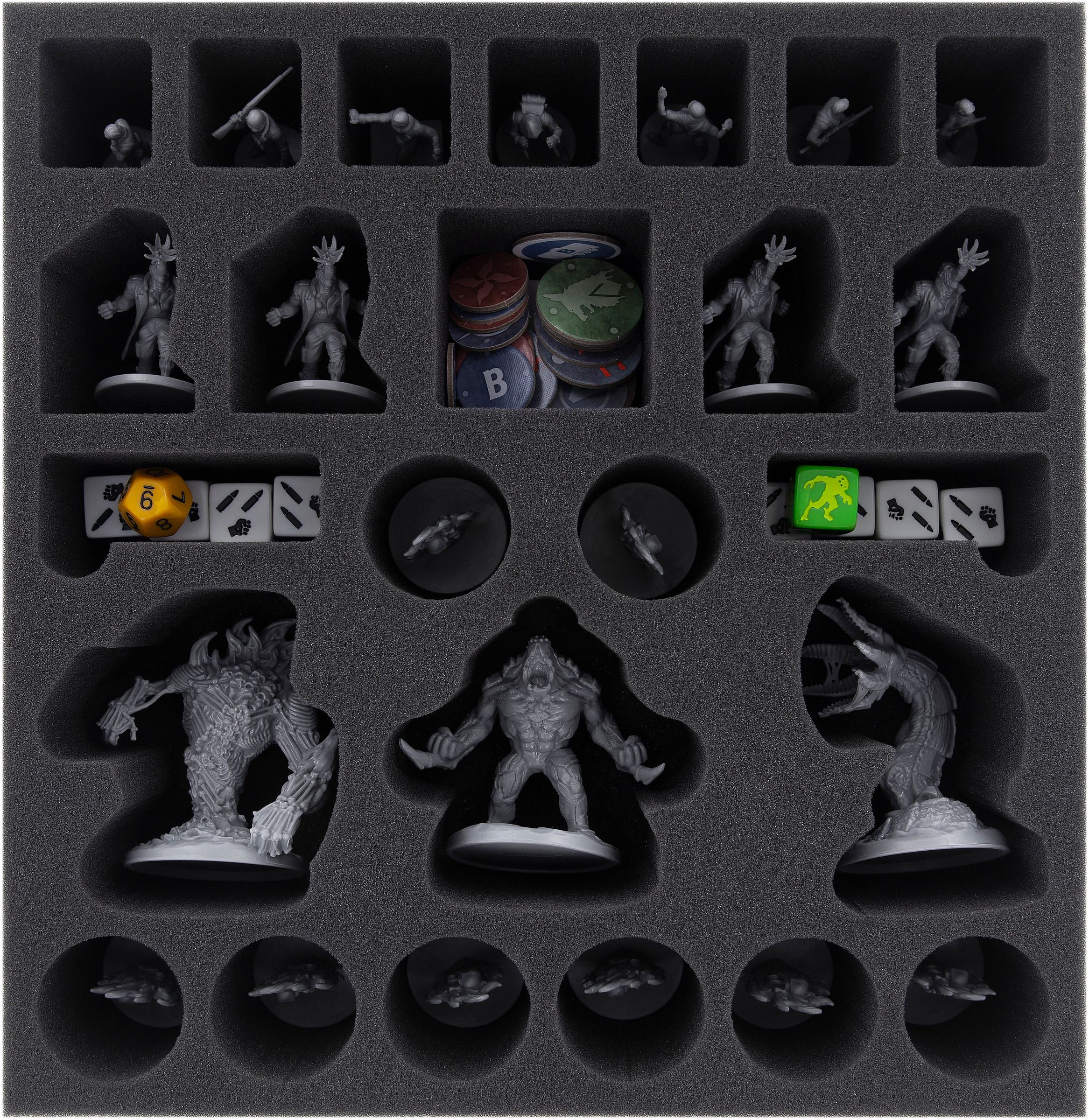 Taktyczna gra planszowa z horrorem oferuje wiele rozrywki z dużą ilością świetnych miniatur i materiałów do gry. Aby bezpiecznie i schludnie przechowywać to wszystko w pudełku, mamy tutaj odpowiedni zestaw pianki do pudełka.