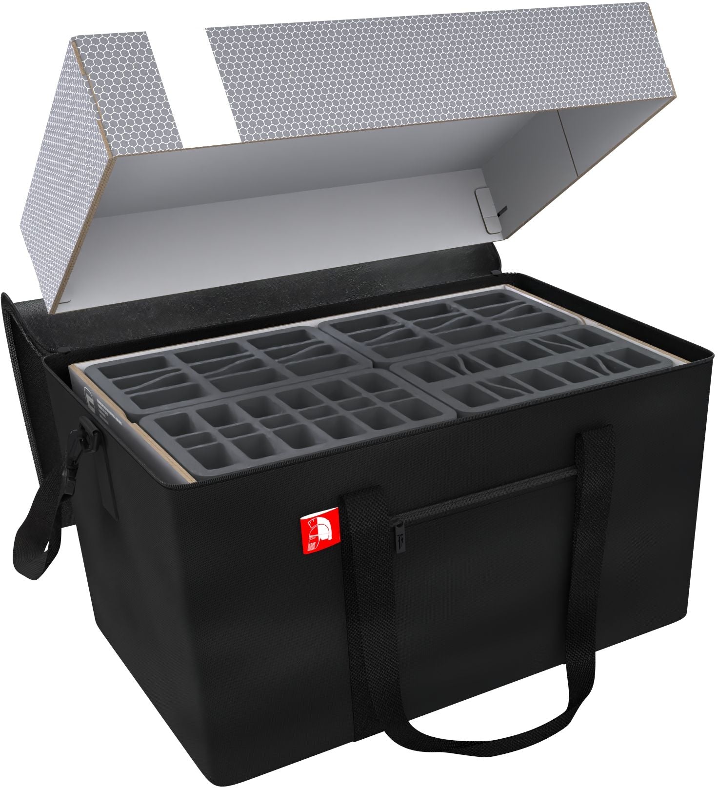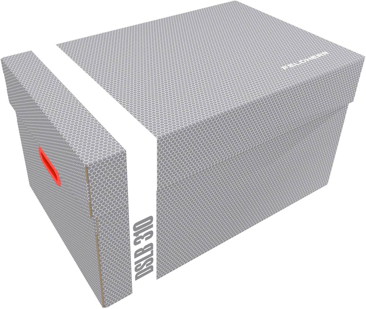 Storage Box DSLB310 jest wykonany z powlekanej tektury falistej. Dzięki temu jest nie tylko przyjemnie lekki, ale także bardzo odporny na rozdarcia i stabilny. Dołączana pokrywa niezawodnie chroni zawartość przed kurzem i innymi czynnikami zewnętrznymi. Dzięki odpowiednim tacom piankowym, miniatury, materiały do gier i wszystkie inne towary mogą być bezpiecznie przechowywane - i wygodnie transportowane za pomocą dwóch wzmocnionych tworzywem sztucznym uchwytów do przenoszenia po bokach.