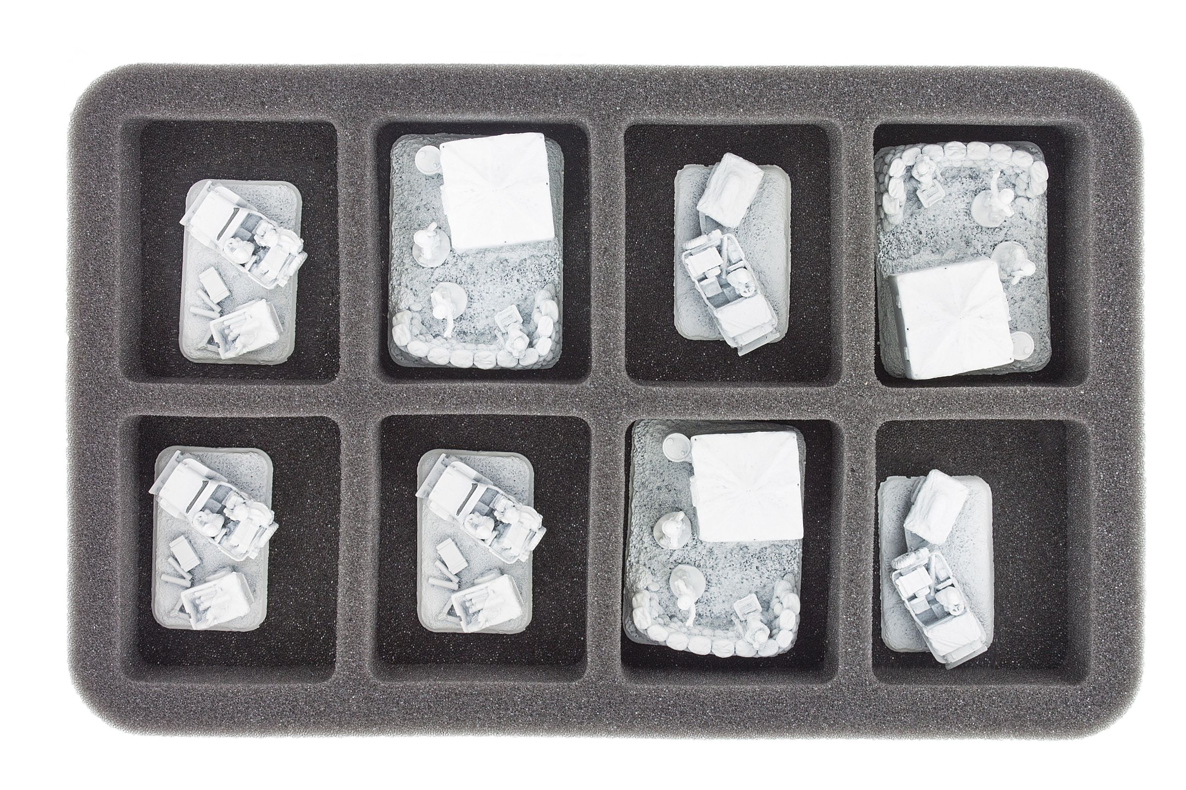 Taca do pianki Feldherr posiada 8 przegródek tej samej wielkości do przejrzystego i bezpiecznego przechowywania miniatur do gier wojennych w skali 1:100 (15 mm). Taca idealnie nadaje się więc do przechowywania miniatur np. gier "Flames of War" lub "Dropzone Commander".