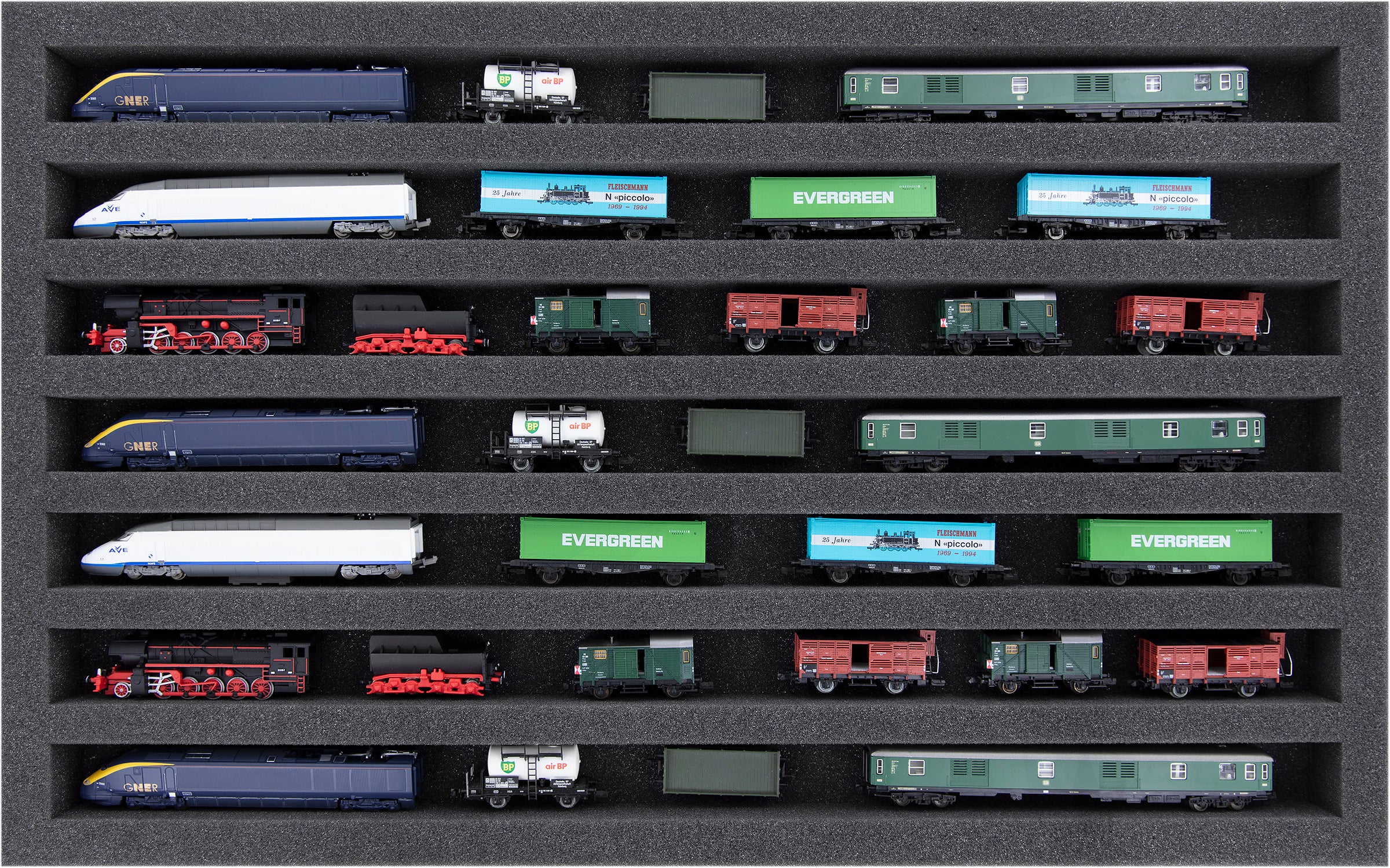 Siedem przedziałów, dostosowanych do poziomego składowania modeli kolejowych w Gauge N, oferuje Twoim wagonom i lokomotywom niezawodną ochronę podczas przechowywania i transportu. Dzięki pozycji leżącej taca ta może być również wykorzystana jako wyświetlacz do prezentacji kolekcji Państwa modeli pociągów.