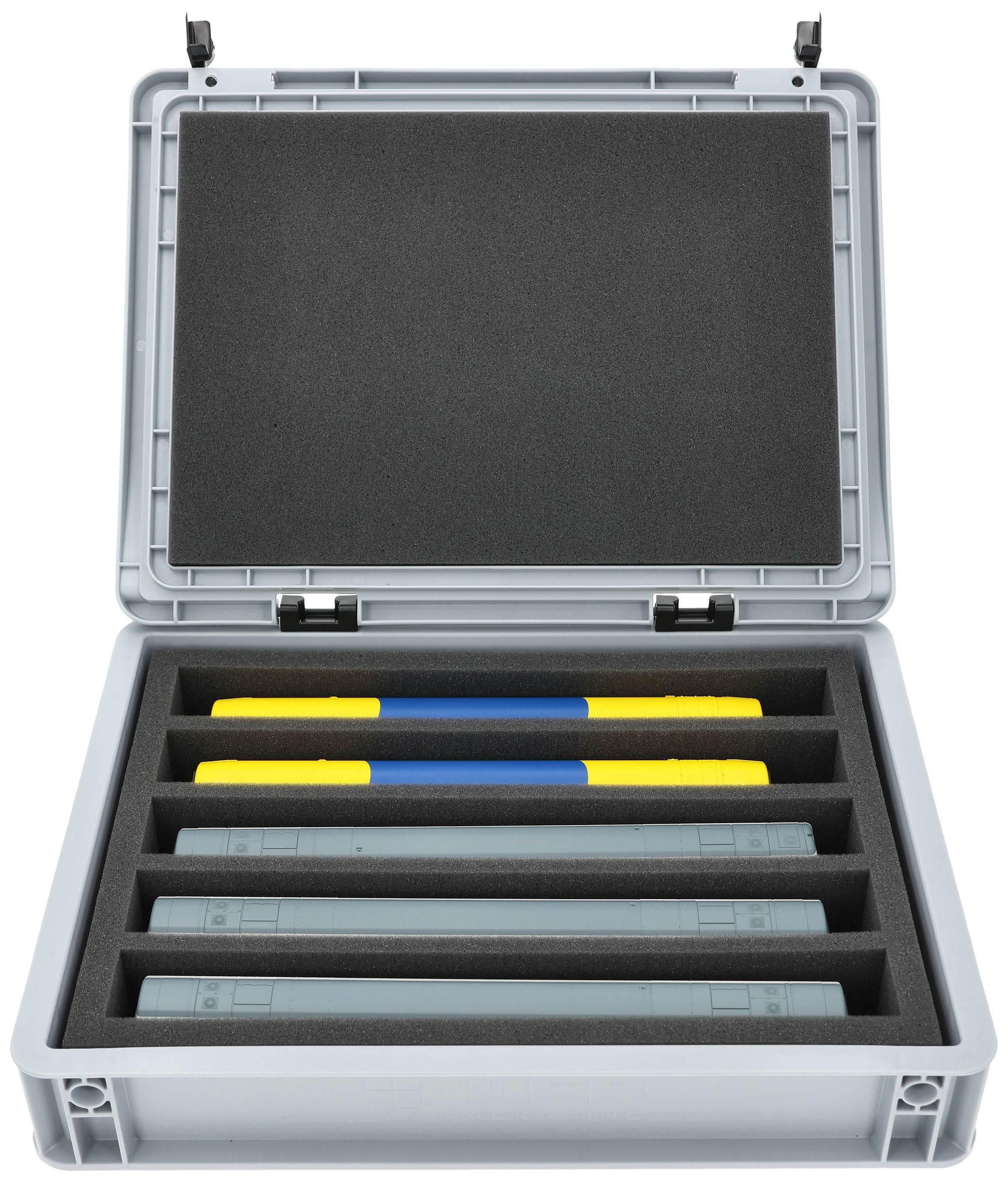 Drobno porowata pianka niezawodnie chroni wrażliwe detale, lakier i mocowania modeli przed zadrapaniami i uszkodzeniami. Wytrzymała skrzynia Eurobox wykonana z odpornego na wstrząsy tworzywa sztucznego zapewnia dodatkową ochronę przed czynnikami zewnętrznymi. Prosty system zawiasów z dwoma zamkami utrzymuje pudełko bezpiecznie zamknięte i chroni zawartość przed kurzem i brudem.