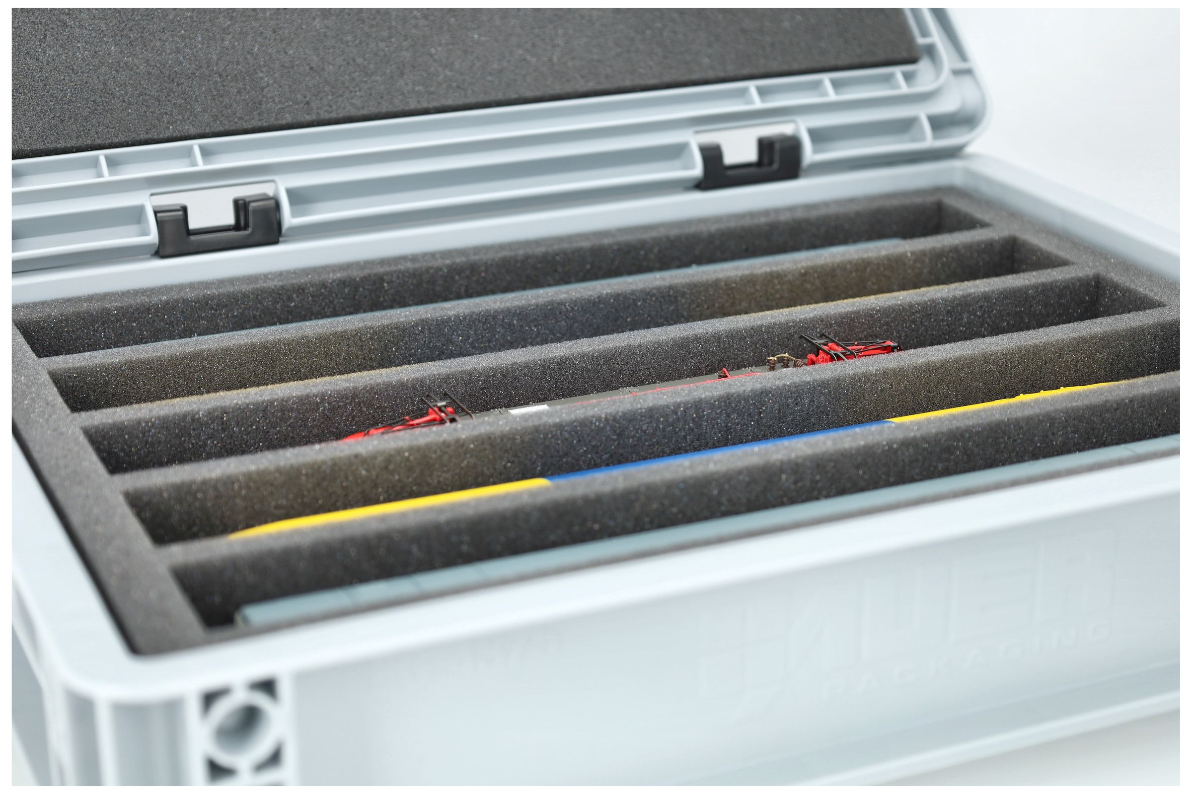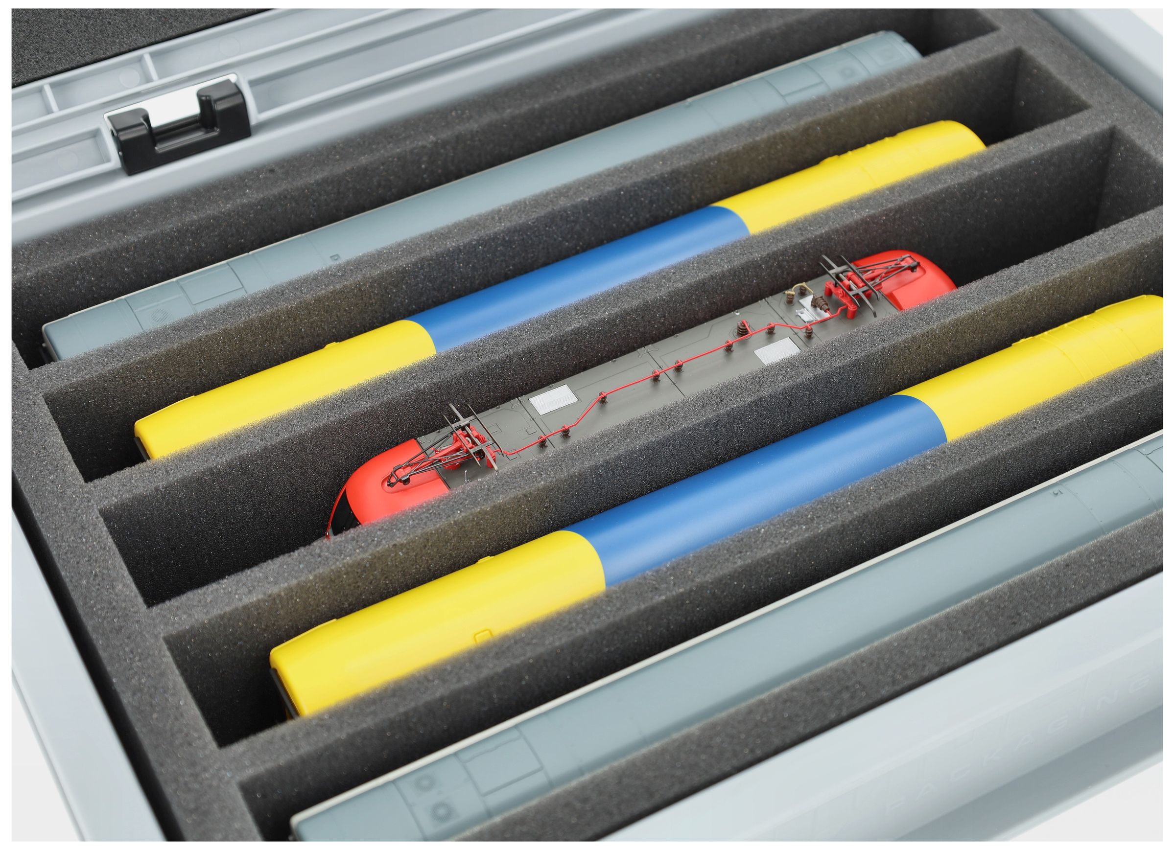Osiem przedziałów (każdy ok. 330 mm 38 mm 55 mm) zostało specjalnie zaprojektowanych dla modeli w skali H0. W zależności od ich długości, kilka wagonów lub lokomotyw może być umieszczonych obok siebie. Dokładne dopasowanie zapewnia, że modele są bezpiecznie zamocowane i nie ślizgają się podczas transportu.