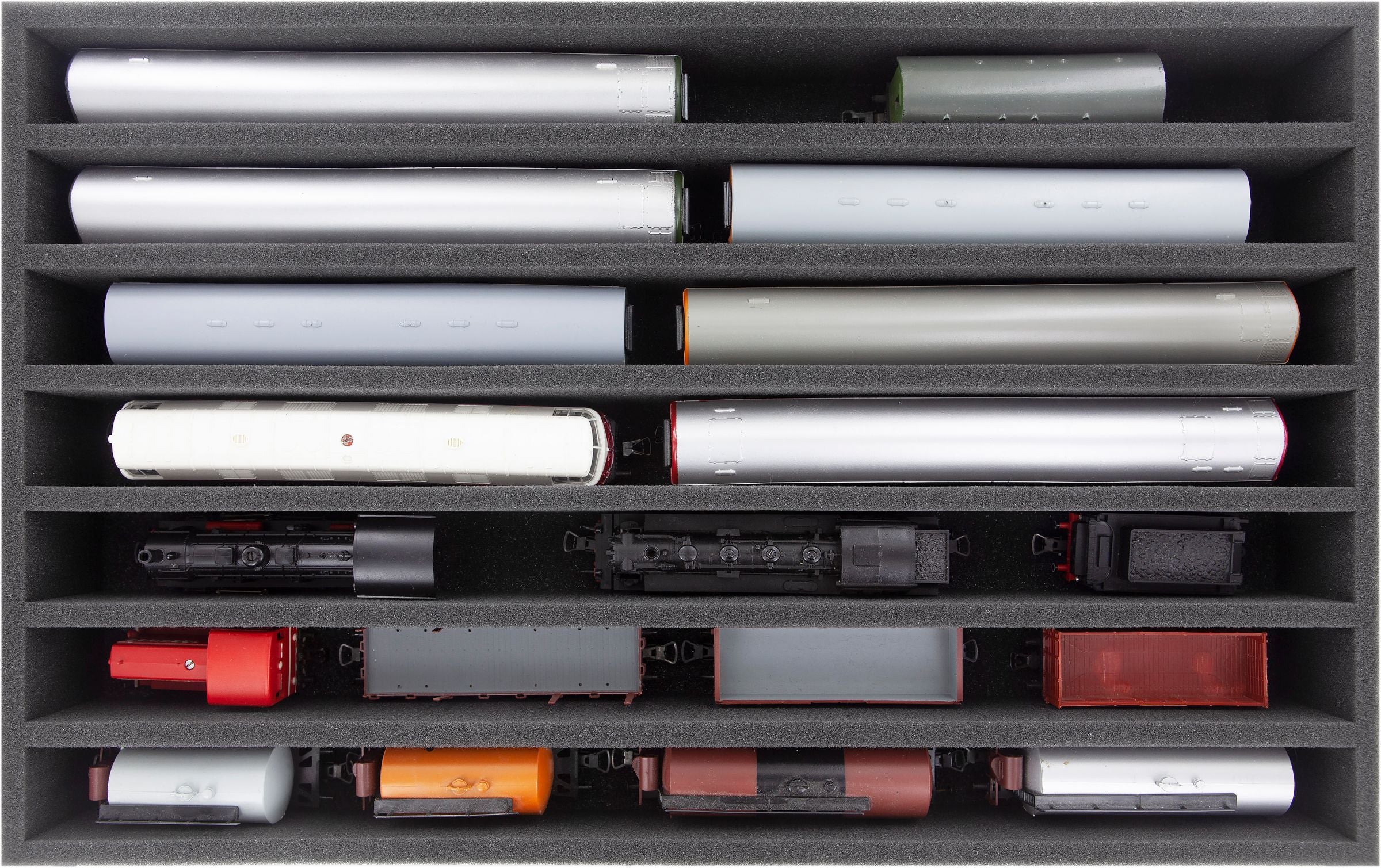 Siedem przegródek, dostosowanych do przechowywania modeli kolejek w rozstawie H0, oferuje Twoim wagonom i lokomotywom niezawodną ochronę podczas przechowywania i transportu.