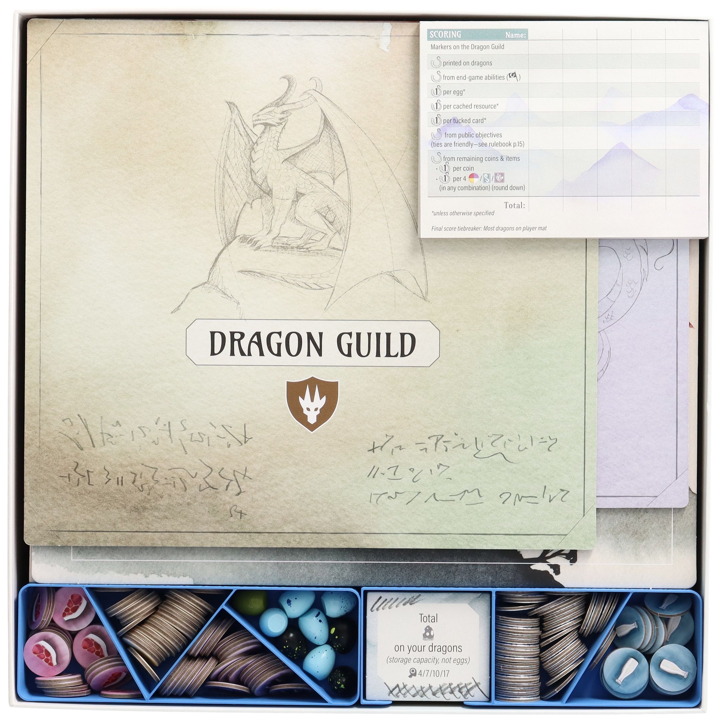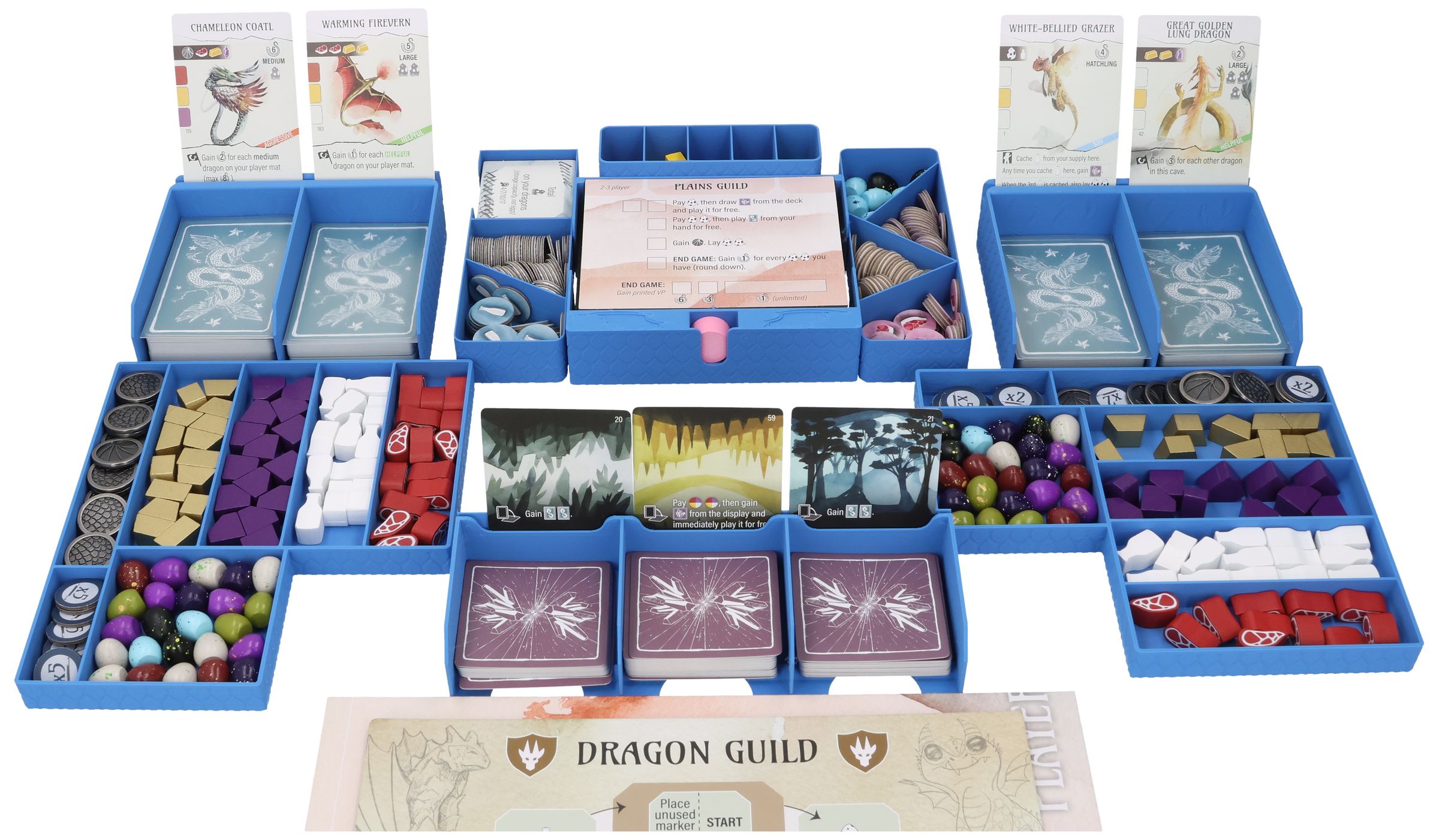 - Większe komponenty gry, takie jak plansza smoczej gildii, kafelki gildii, plansze do wyświetlania i śledzenia kart, maty graczy, podkładka do wyników i podręczniki zasad są umieszczone na plastikowych wkładkach.