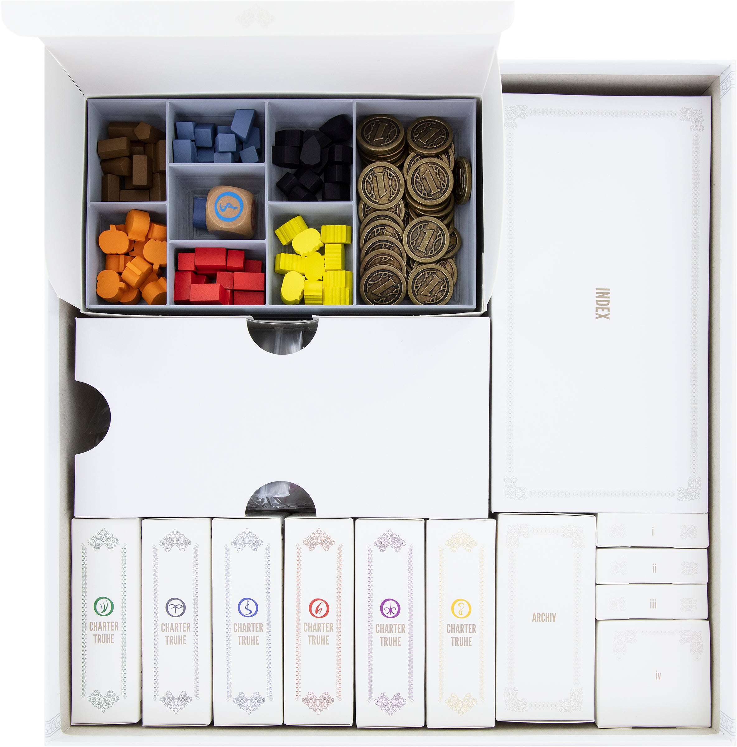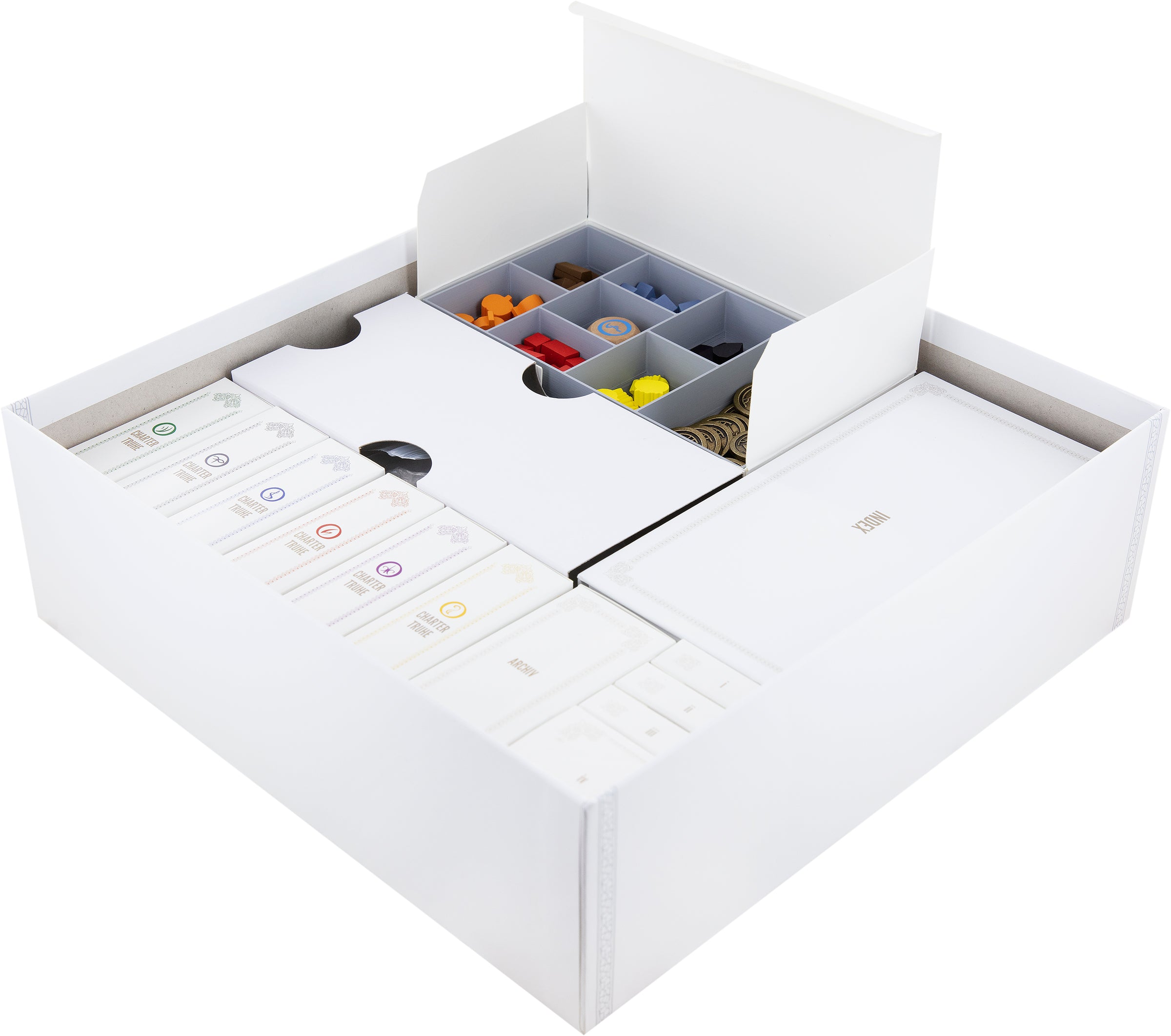 Aby cała zawartość pudełka z grą planszową trzymała się mocno, nawet po odblokowaniu materiałów do gry potrzebne są różne kartonowe wkładki. Skrzynie kart, Archiwa oraz skrzynie i-iv, a także skrzynia Scriptorium i skrzynia Indeks zapewniają niezbędną stabilność w pudełku z grą planszową.