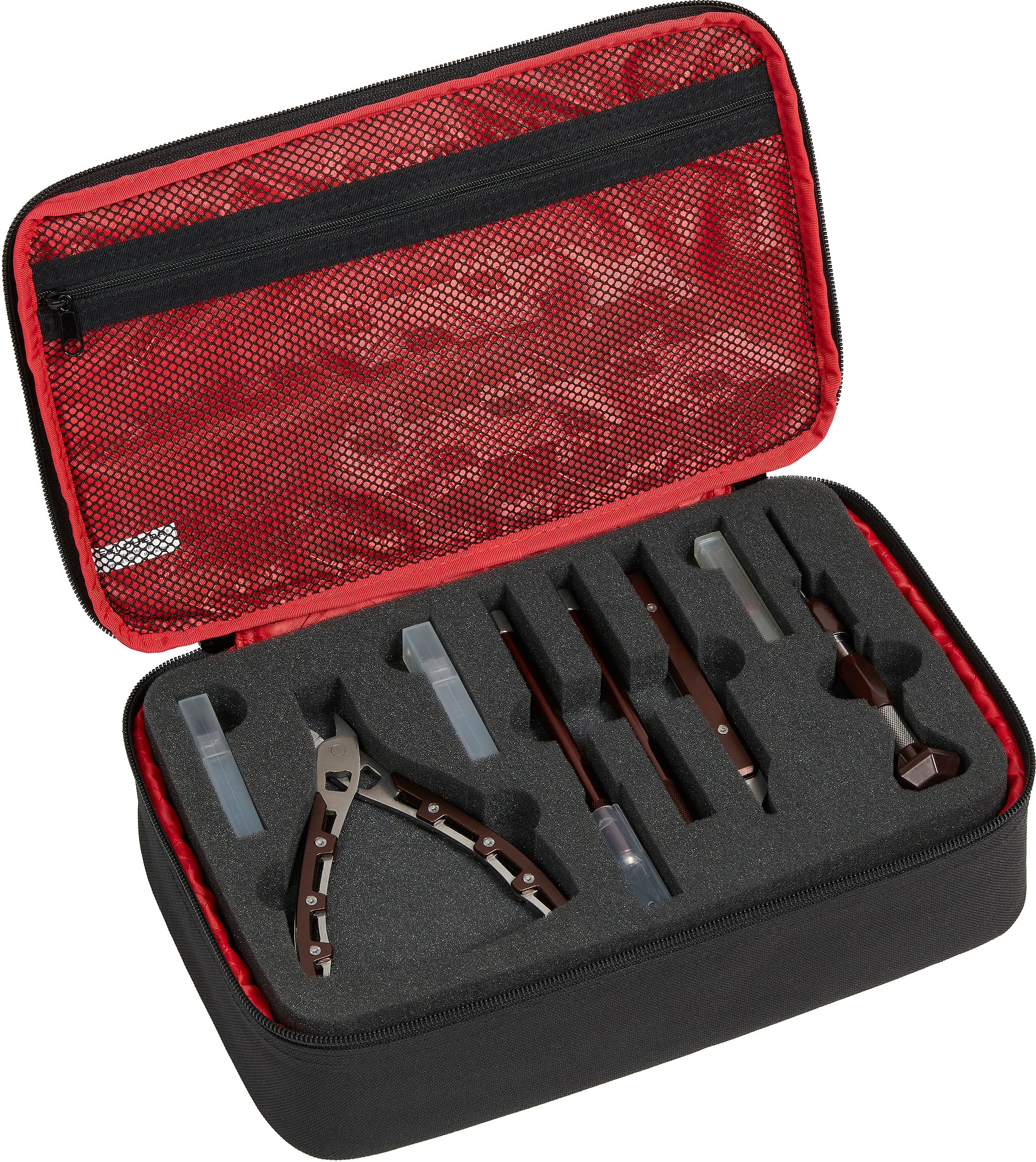 Wkład podzielony jest na 8 przedziałów o różnych kształtach. Największy z nich oferuje miejsce na obcinak do tworzyw sztucznych. W dodatkowych schowkach można w przejrzysty sposób przechowywać noże rzemieślnicze, noże do cięcia (noże z zatrzaskiwanymi ostrzami), pilniki, wiertła i pęsetę.