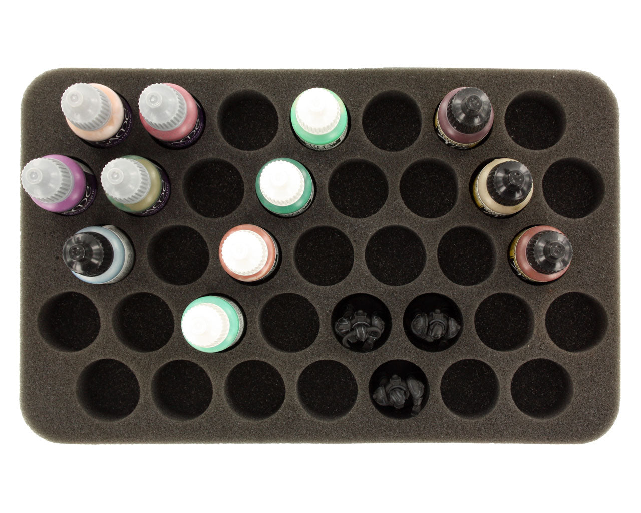 Dlatego też wkładka idealnie nadaje się do poziomego przechowywania butelek Model Color o pojemności 17 ml firmy Vallejo, butelek 18 ml firmy Army Painter oraz podobnej wielkości butelek z farbami innych producentów.