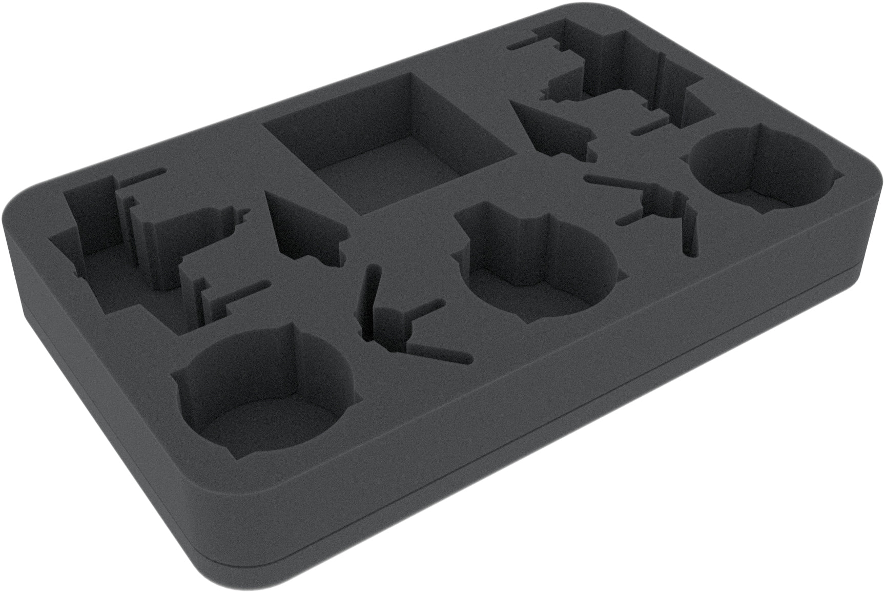 Na każdym statku znajduje się miniaturowo precyzyjnie wycięta komora na tej płytce Half-Size. Precyzyjnie dopasowany krój zapewnia pewne dopasowanie, dzięki czemu miniatura statku pozostaje na miejscu podczas transportu. Chroni to nie tylko drobne części, takie jak skrzydła, anteny i broń przed uszkodzeniem, ale także farbę przed ścieraniem i zadrapaniami.
