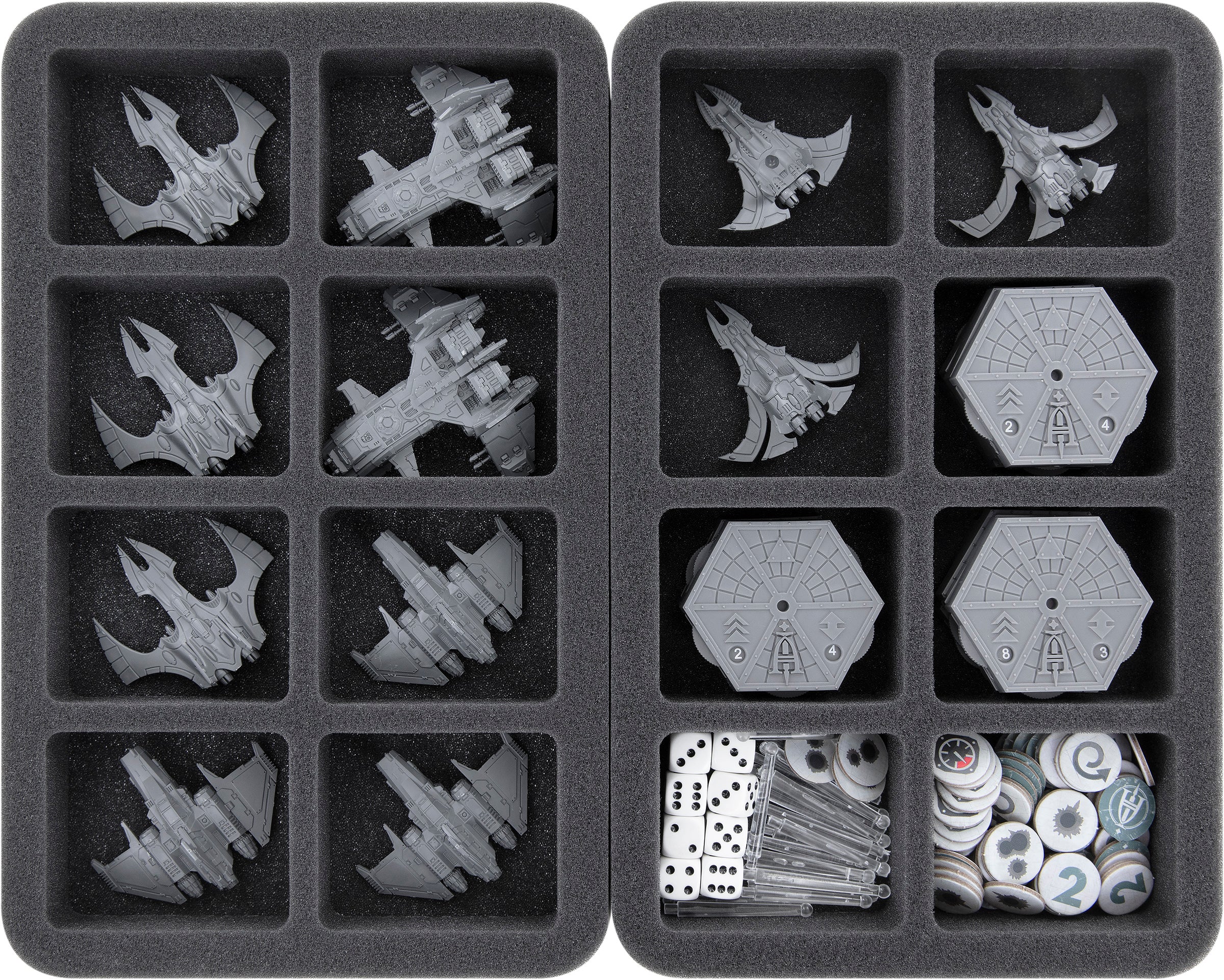 - 2 tacki z pianki Half-Size z 8 przegródkami każda na Adeptus Astartes Xiphon Interceptors, Adeptus Astartes Storm Eagles, Asuryani Nightwings, Asuryani Phoenix Bombers, bazy, Flying Rods, żetony i kości (HS035BF02BO)