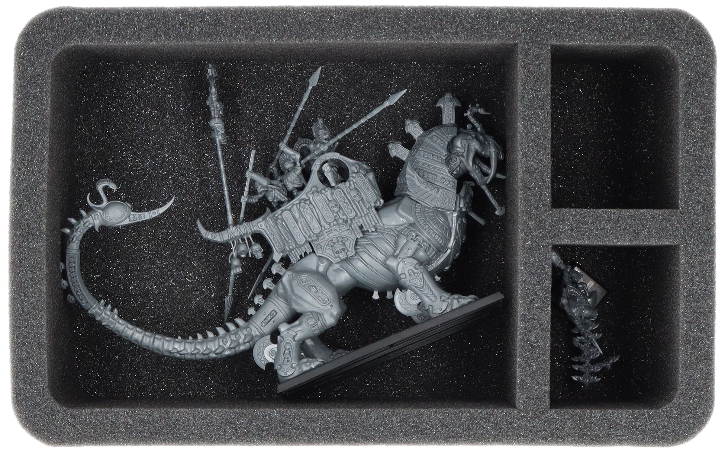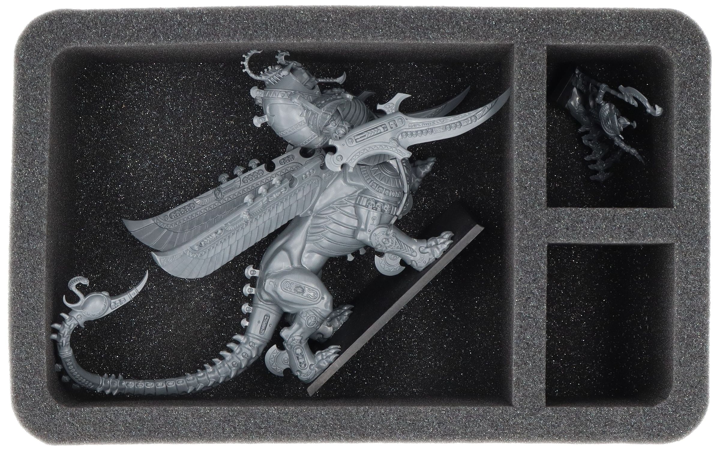 Indywidualnie dopasowana komora jest odpowiednia zarówno dla Necrosphinx, jak i dwóch wariantów War Sphinx. Możesz użyć dwóch mniejszych przegródek na dodatkowe modele piechoty Tomb Kings, takie jak Tomb King lub miniatury o podobnych wymiarach.