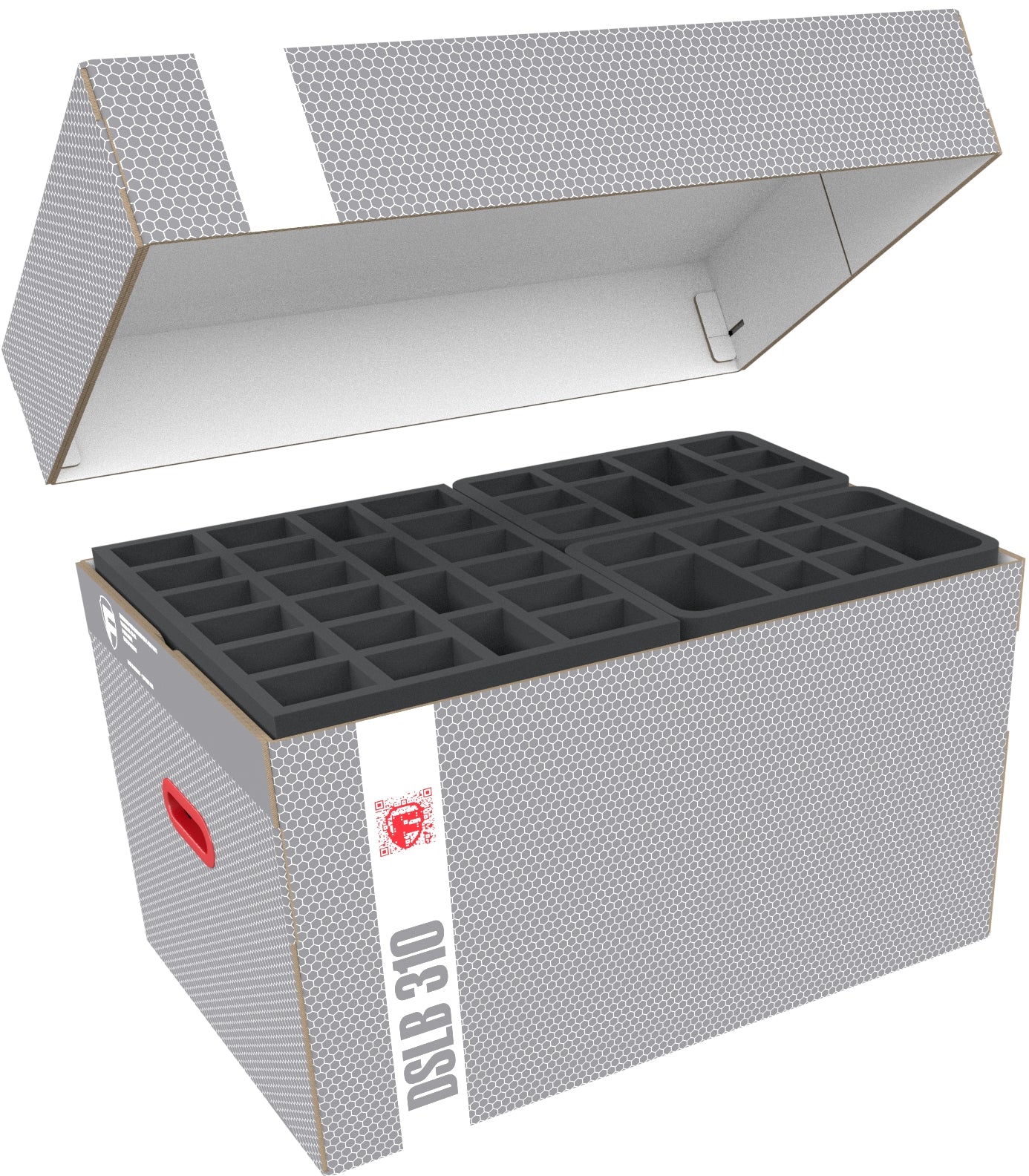 Storage Box DSLB310 jest wykonany z powlekanej tektury falistej.Dzięki temu jest nie tylko przyjemnie lekka, ale także bardzo odporna na rozdarcia i stabilna.Dołączana pokrywa niezawodnie chroni zawartość przed kurzem i innymi czynnikami zewnętrznymi.Dzięki odpowiednim tacom piankowym, miniatury, materiały do gier i wszystkie inne towary mogą być bezpiecznie przechowywane - i wygodnie transportowane za pomocą dwóch wzmocnionych tworzywem sztucznym uchwytów do przenoszenia po bokach.