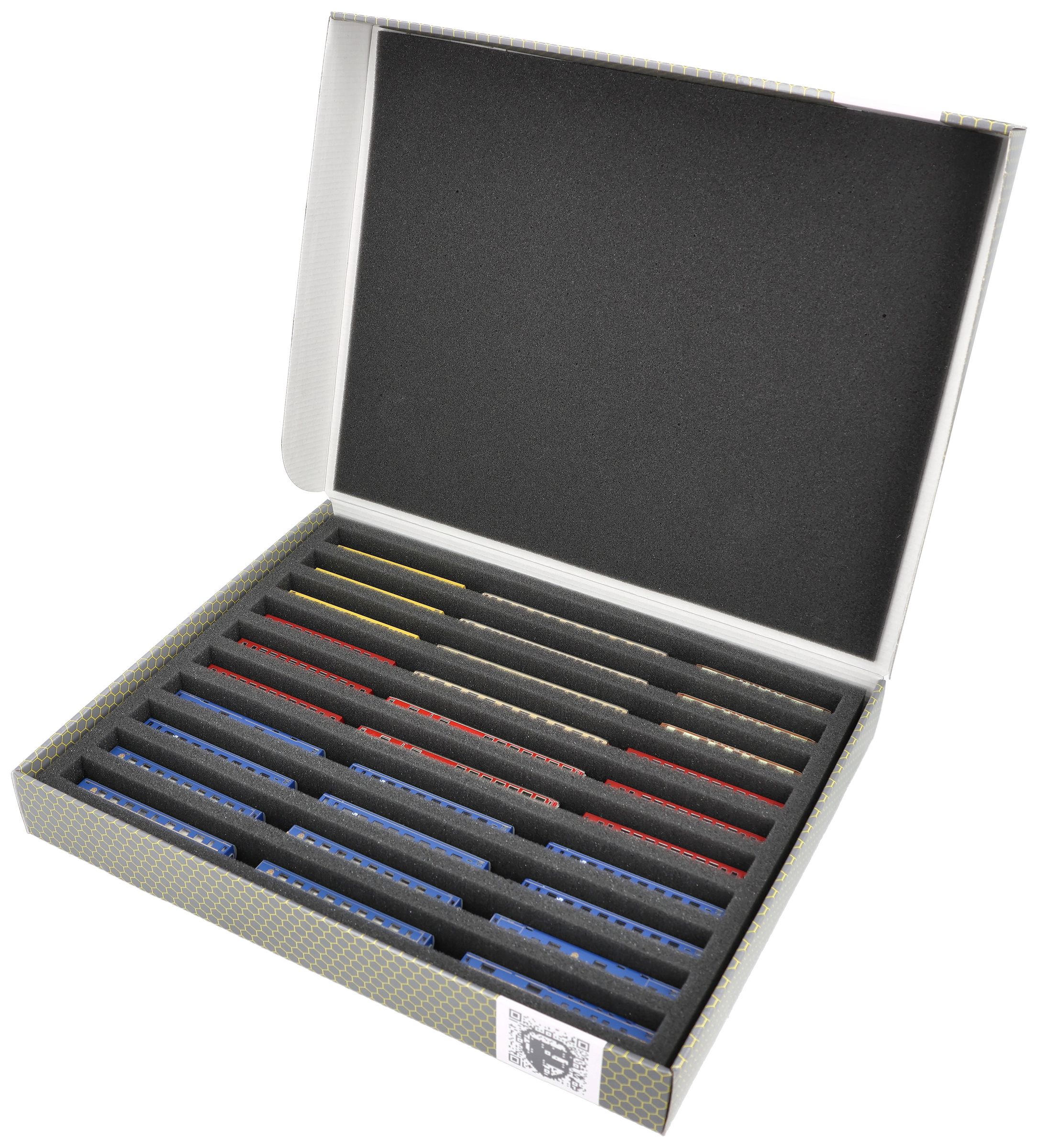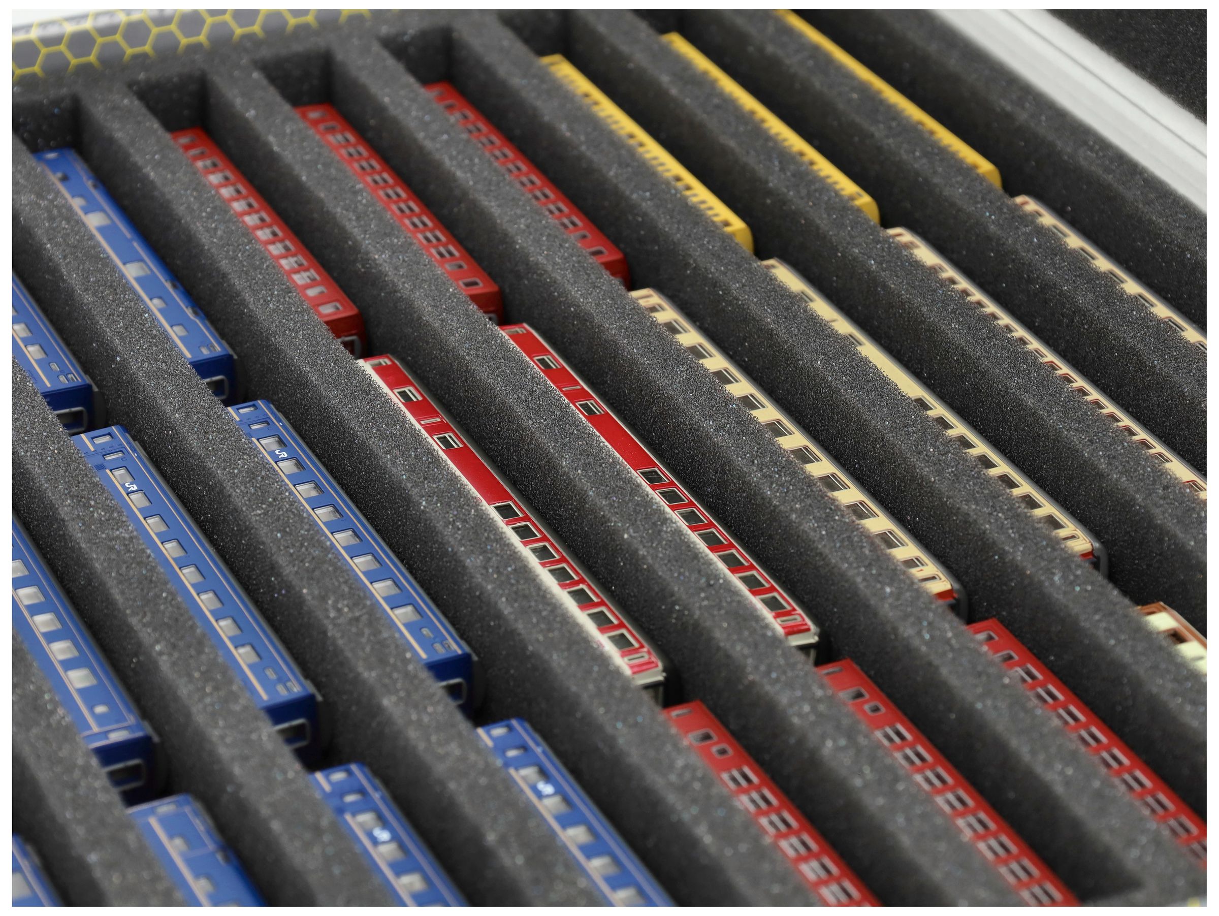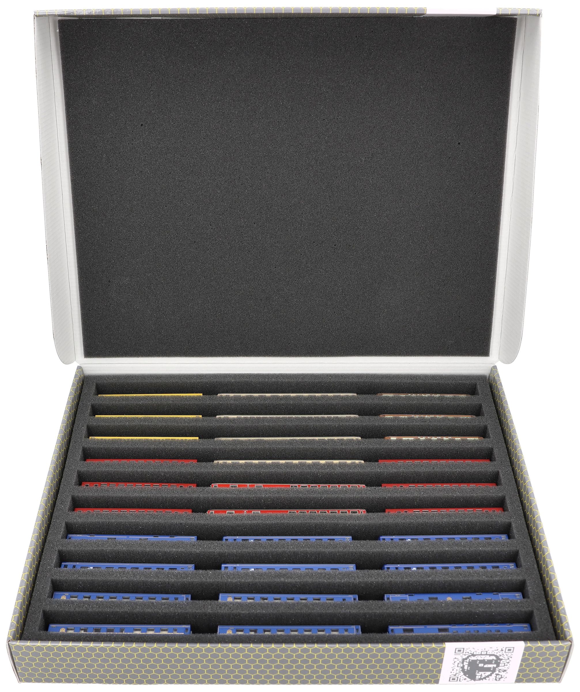 Dziesięć przedziałów, przystosowanych specjalnie do szynowych modeli Z Gauge, oferuje Twoim wagonom i lokomotywom niezawodną ochronę podczas przechowywania i transportu. Wagony i lokomotywy są składowane na stojąco.