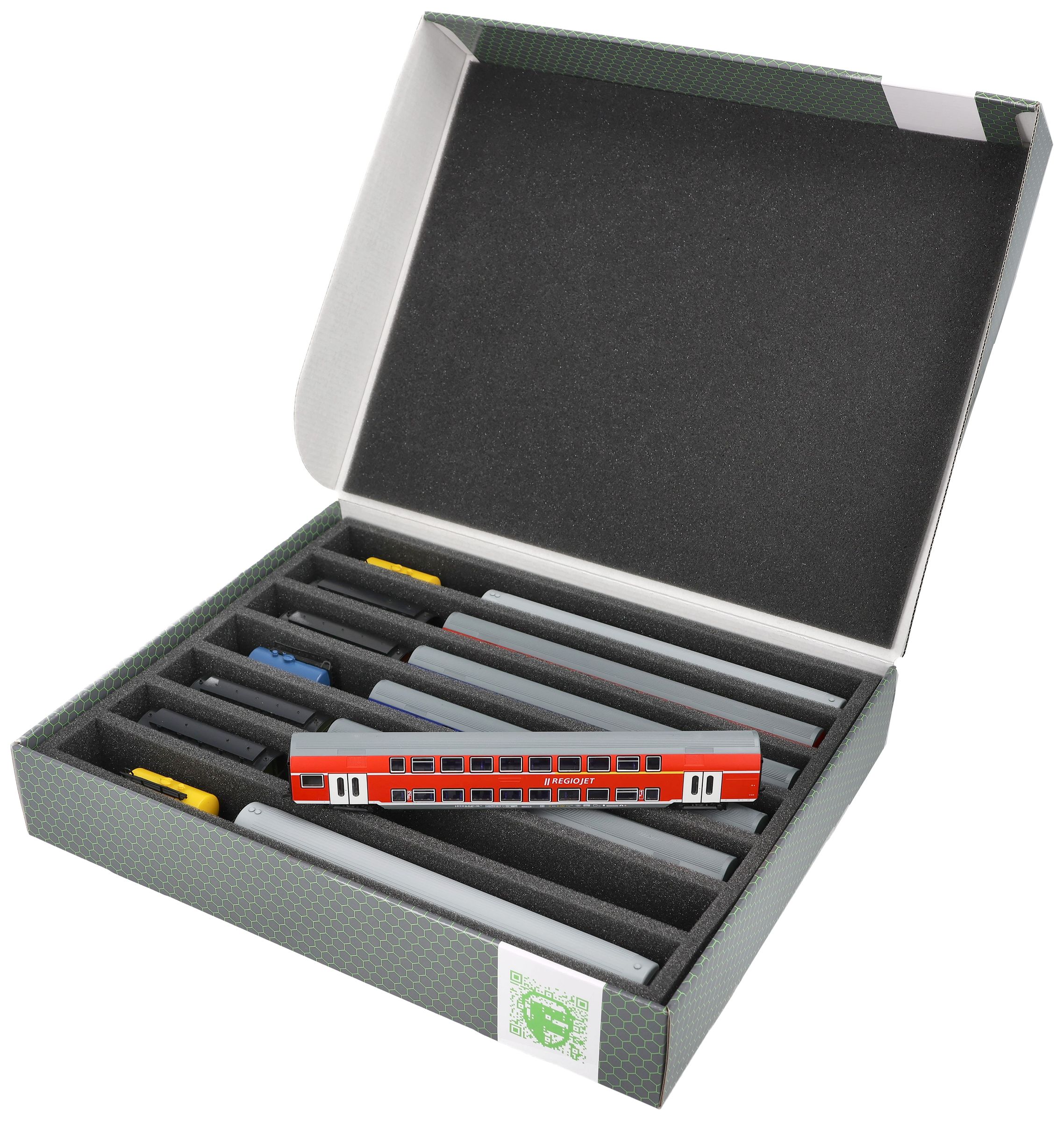 Siedem przedziałów - dostosowanych do potrzeb kolei modelarskich w skali TT, w pozycji pionowej - oferuje Twoim wagonom i lokomotywom niezawodną ochronę podczas przechowywania i transportu.