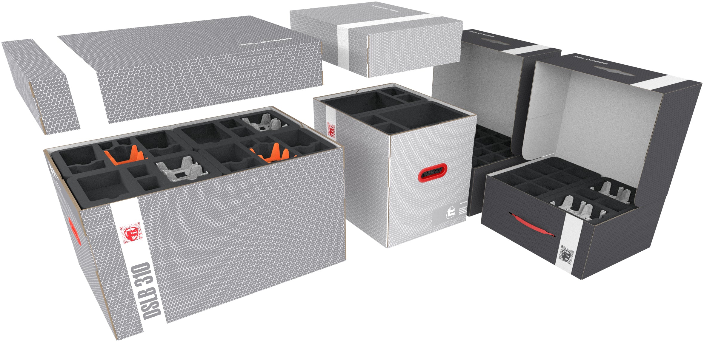 Storage Box DSLB310 i FSLB310 są wykonane z powlekanej tektury falistej. Dzięki temu są przyjemnie lekkie, bardzo odporne na rozdarcia i stabilne. Dołączana pokrywa niezawodnie chroni zawartość przed kurzem i innymi czynnikami zewnętrznymi. Dzięki odpowiednim tacom piankowym, miniatury, materiały do gry i inne towary mogą być bezpiecznie przechowywane - i wygodnie transportowane za pomocą dwóch wzmocnionych tworzywem sztucznym uchwytów do przenoszenia po bokach.
