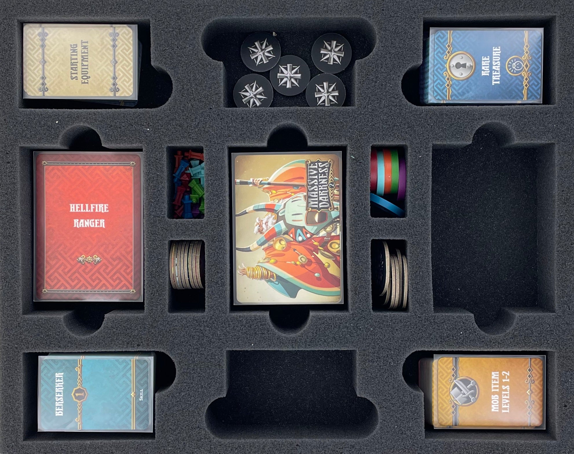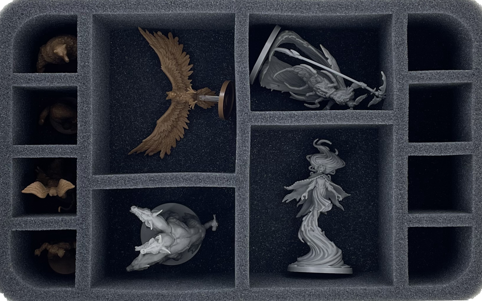 Poszczególne tacki z przegródkami na karty, kości i żetony pomagają śledzić materiały do gry. Uzupełnieniem wkładek są plastikowe tacki, takie jak uchwyty na małe karty, które można dopasować do odpowiednich przegródek piankowych tacek.