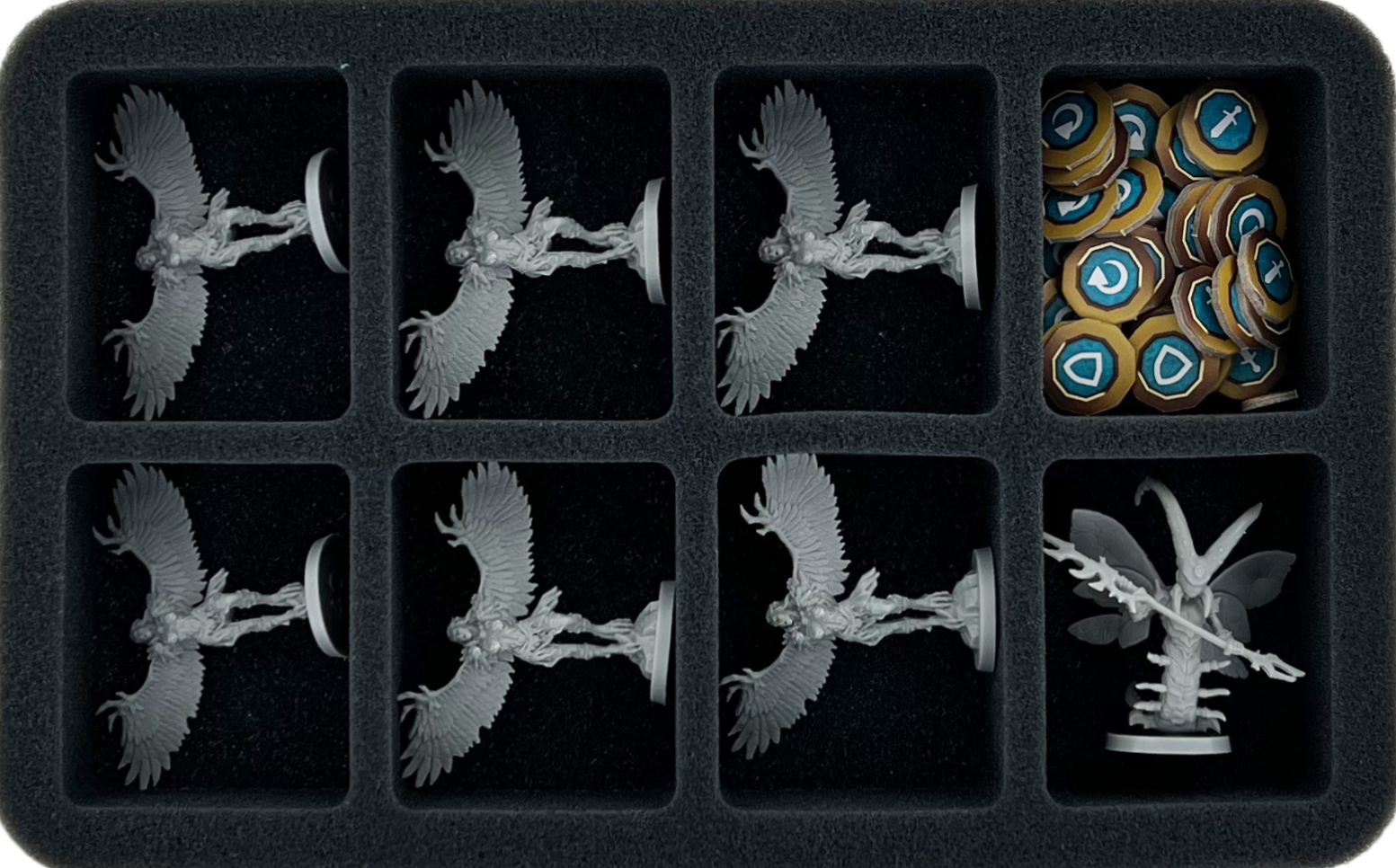 - 1 taca piankowa Half-Size z 8 przegrodami na wystające miniatury + żetony (HS040BF02BO)