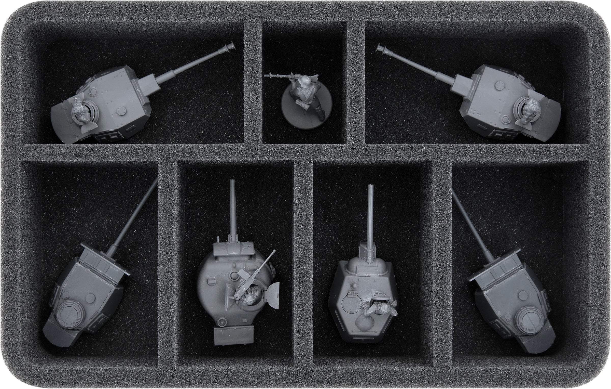 - 2 tace z pianki Half-Size z 7 przegrodami na wieżyczki czołgów pasujące do modeli Tank III, Tank IV, T34, M4 Sherman, Tiger + 2 jednostki piechoty (HS055A009)