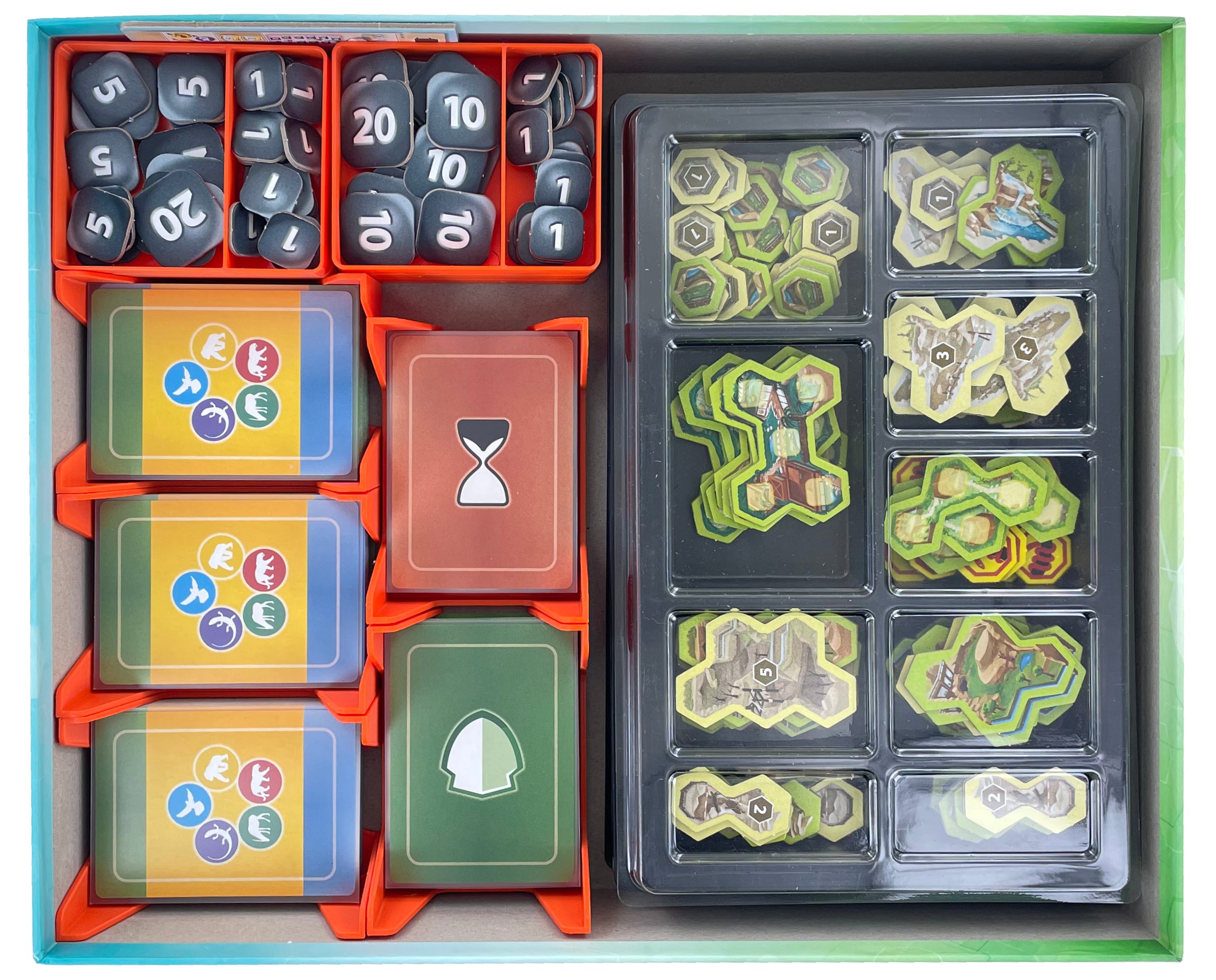 Aby ułatwić zwierzętom godne życie w zagrodach, przejęliśmy kontrolę nad pudełkiem do gry planszowej. Do istniejących pudełek z organizerami dodaliśmy 5 uchwytów na karty i 6 uchwytów na żetony, dzięki czemu w sensowny sposób pomieściliśmy materiały do gry. w sensowny sposób. Podczas gdy większość żetonów znika w oryginalnych organizerach, żetony pieniężne, karty i drewniane komponenty przechowujesz w plastikowych tackach Feldherr. Drewniane komponenty są posortowane według kolorów, a każdy gracz otrzymuje swoją własną wkładkę. Na stronie Aby szybko rozpocząć grę, wyjmij z pudełka pudełka do sortowania oraz pozostałe tacki i rozłóż je na stole. Jesteście gotowi do gry.