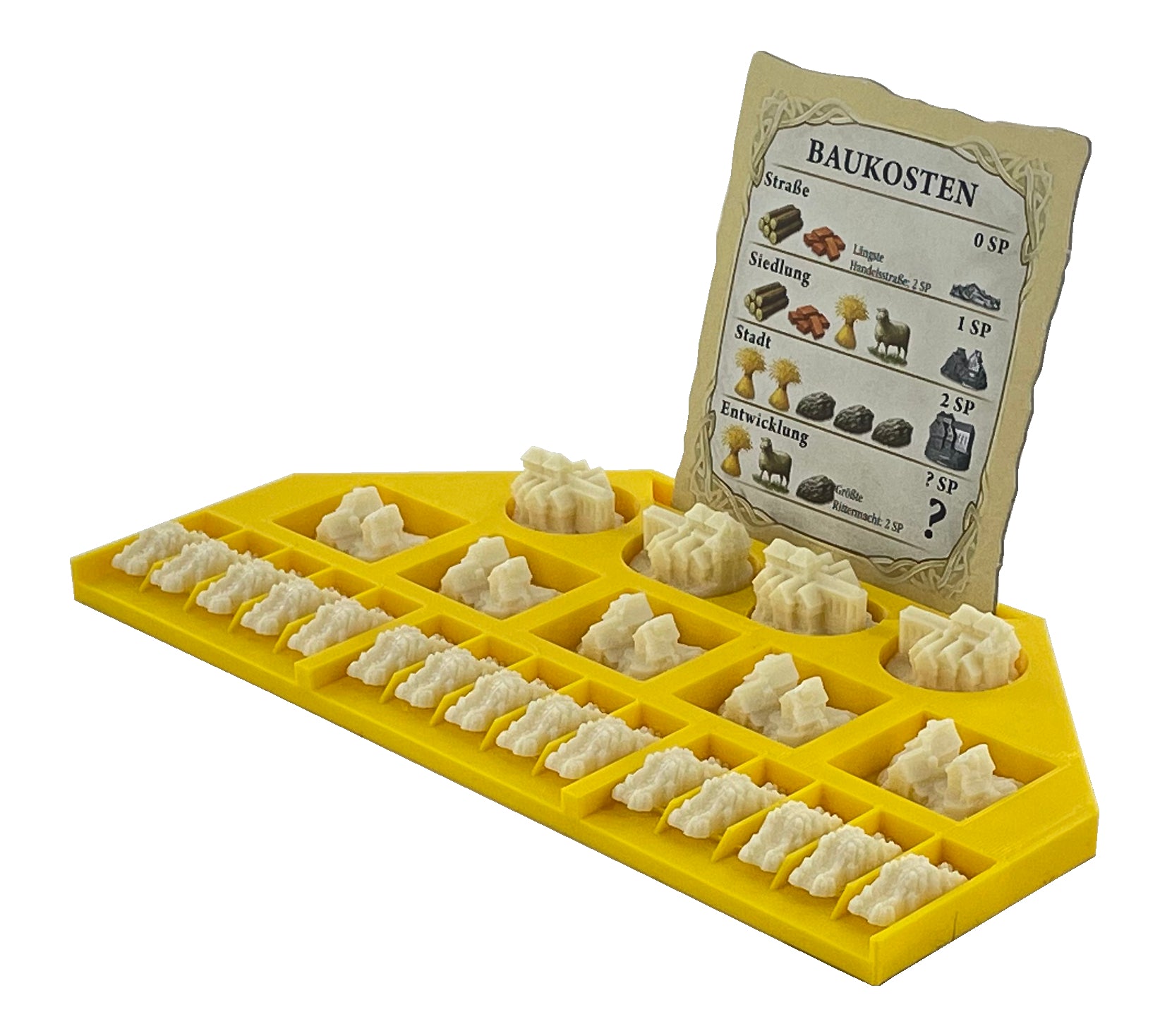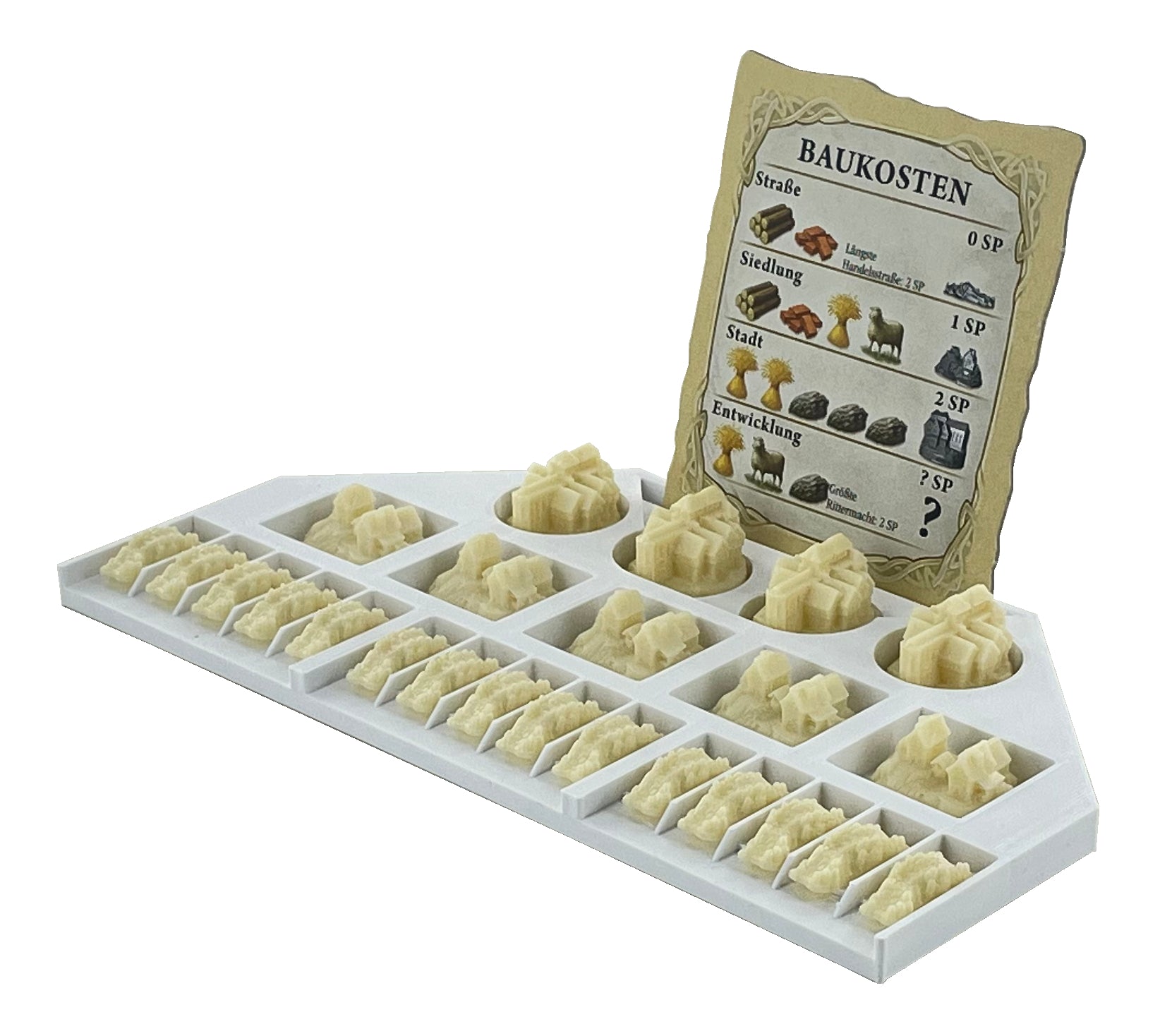 - Łącznie do dyspozycji są 24 przegródki i slot na karty. Wykorzystaj 15 przegródek na miniatury dróg (lub statków z rozszerzeniem "Seafarers"), 5 na osady, a 4 na swoje miasta. W szczelinie na karty możesz umieścić karty "kosztów budowy".