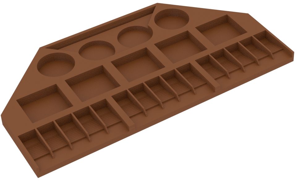 - Modele miast i osad przechowywane są w głębokich przegródkach, natomiast przegródki na ulice nachylone są do środka. Miniatury nie przesuwają się podczas gry, ale można je łatwo wyjąć z przegródek.
