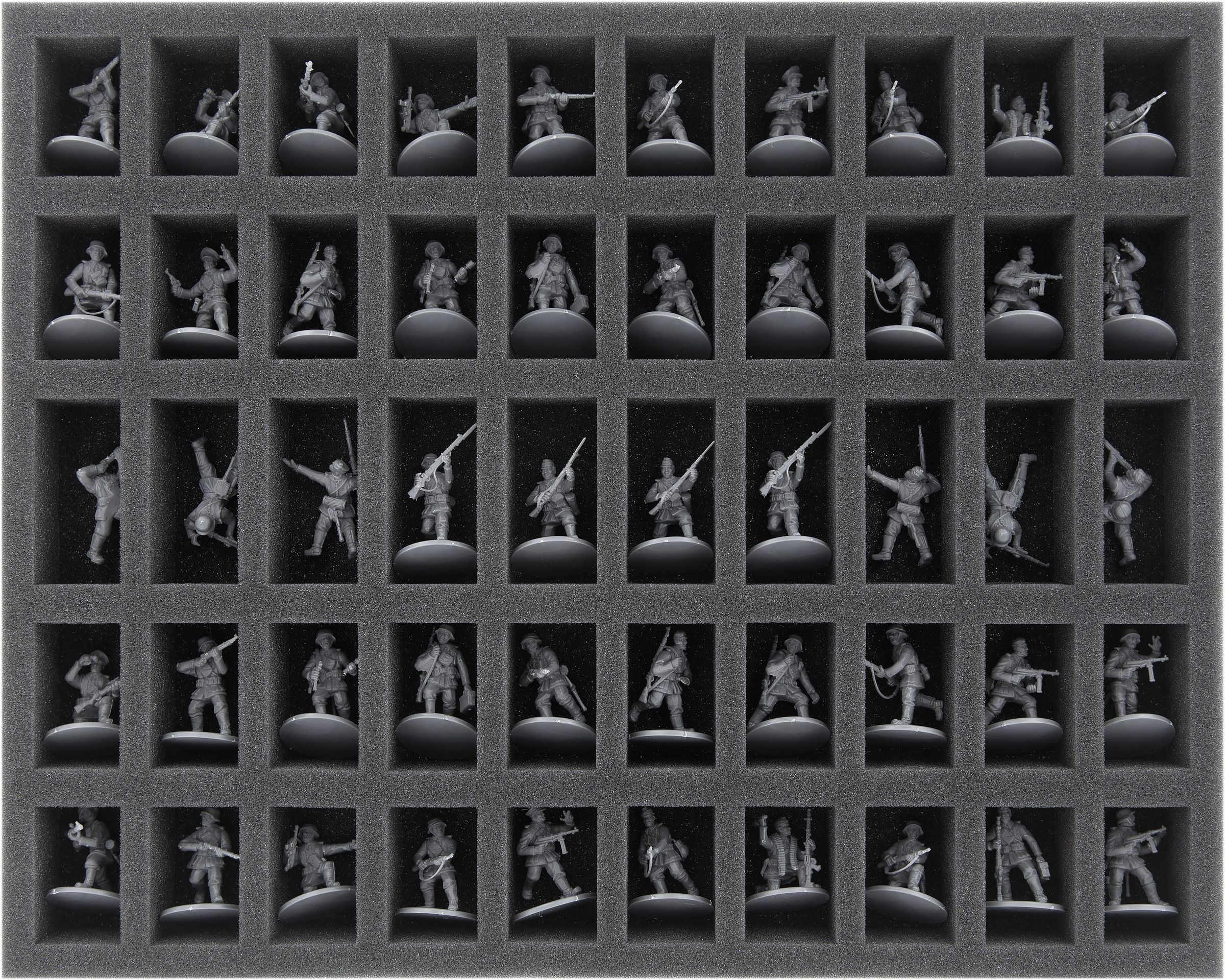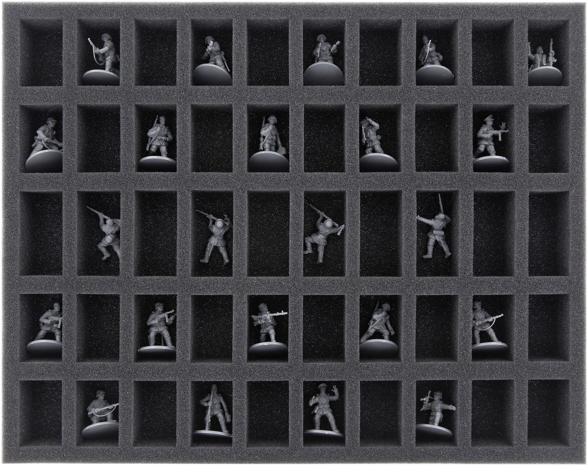 Taca z pianki posiada 50 przegródek na bezpieczne przechowywanie 28 mm jednostek piechoty Bolt Action.